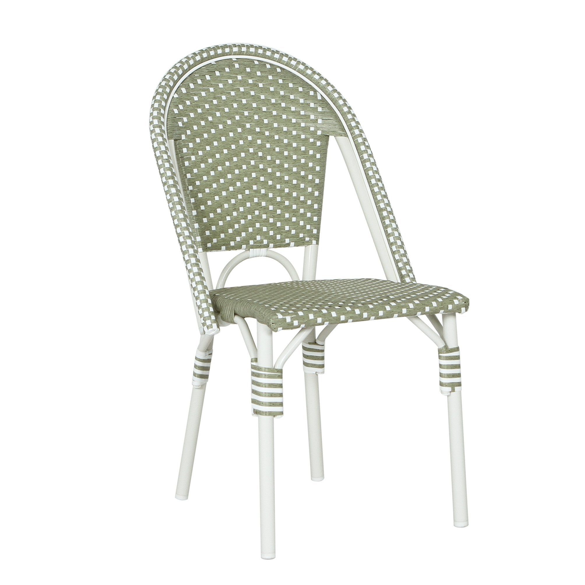 Bring a touch of Parisian cafe charm to your patio, balcony, or sunroom with this elegant set of two French-style bistro chairs. Combining a rust-resistant aluminum frame with handwoven PE (polyethylene) rattan, these chairs deliver a lightweight yet durable seating solution that balances classic curves and subtle green-and-white color accents for a relaxed, sophisticated outdoor setting.