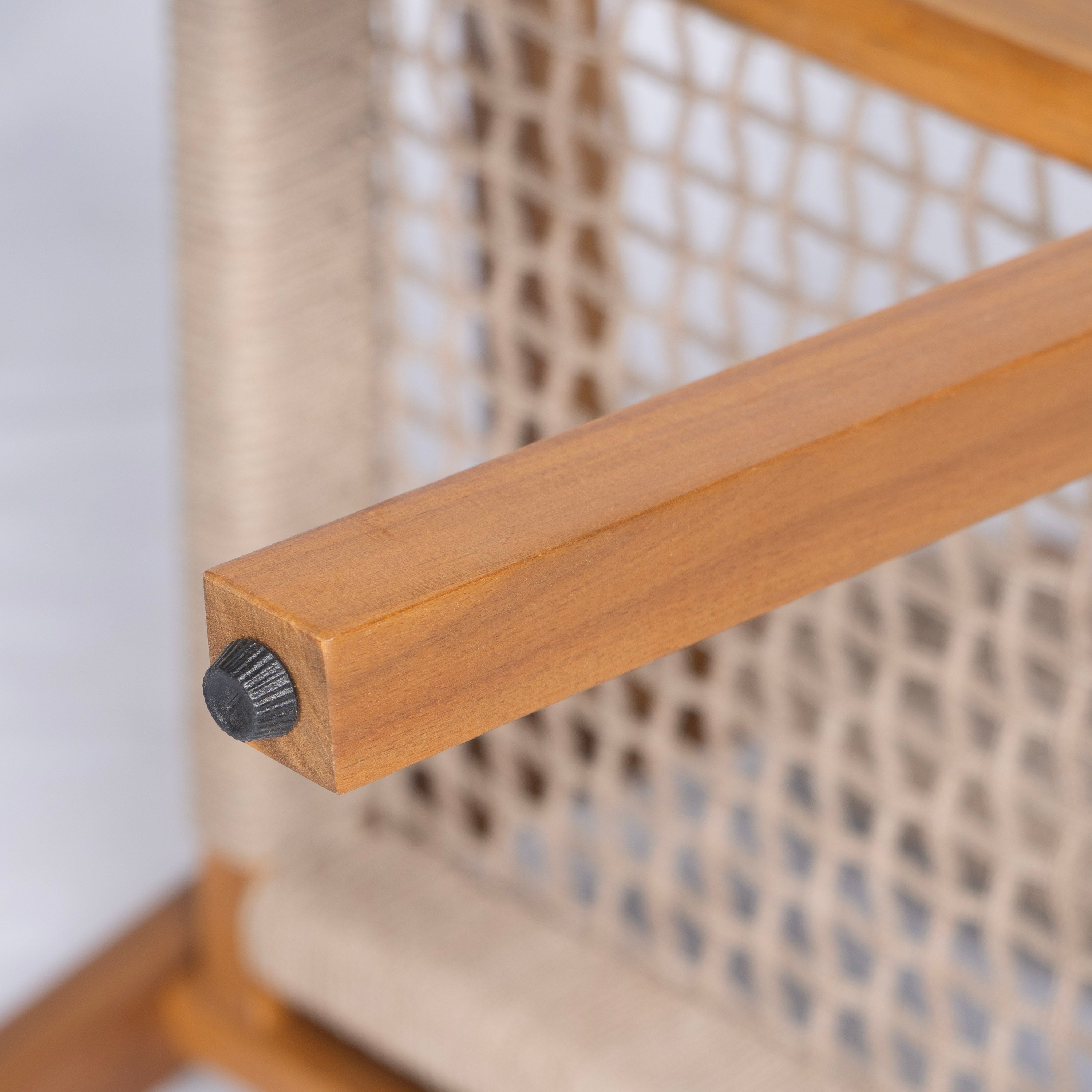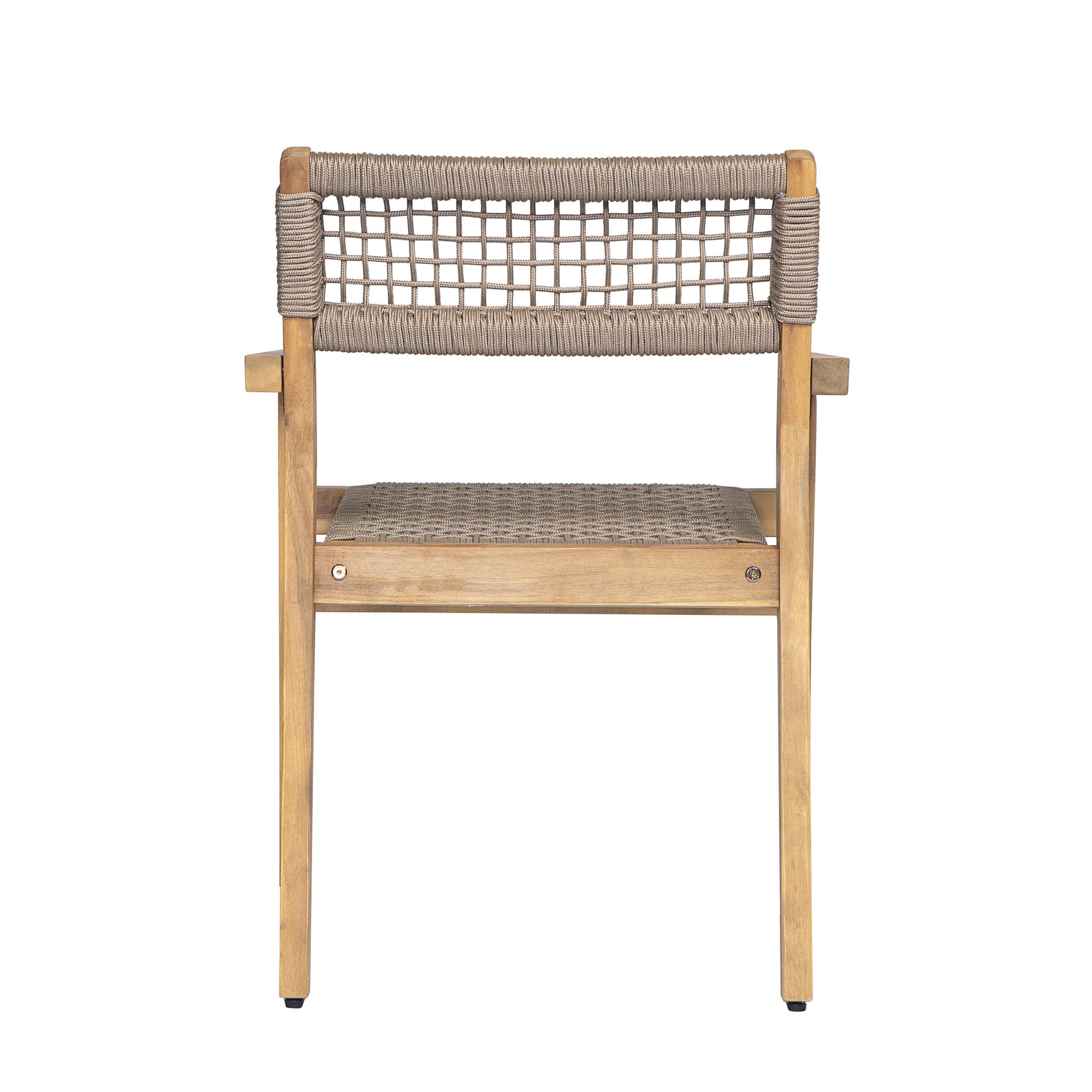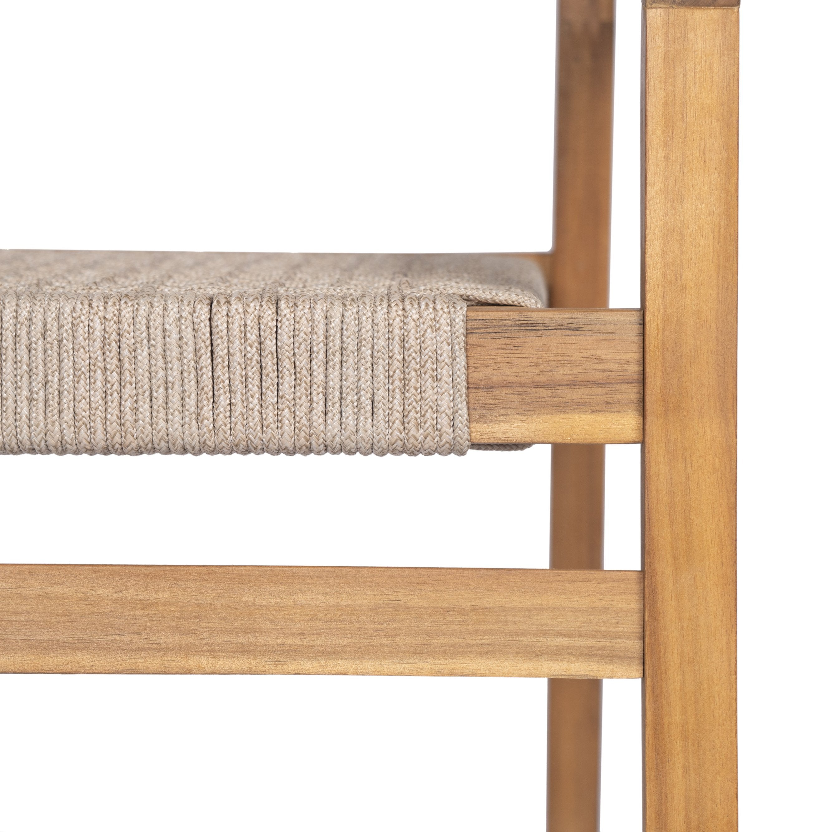 - Materials: Solid acacia wood frame with a rope-woven backrest; durable, weather-resistant finish in Light Teak