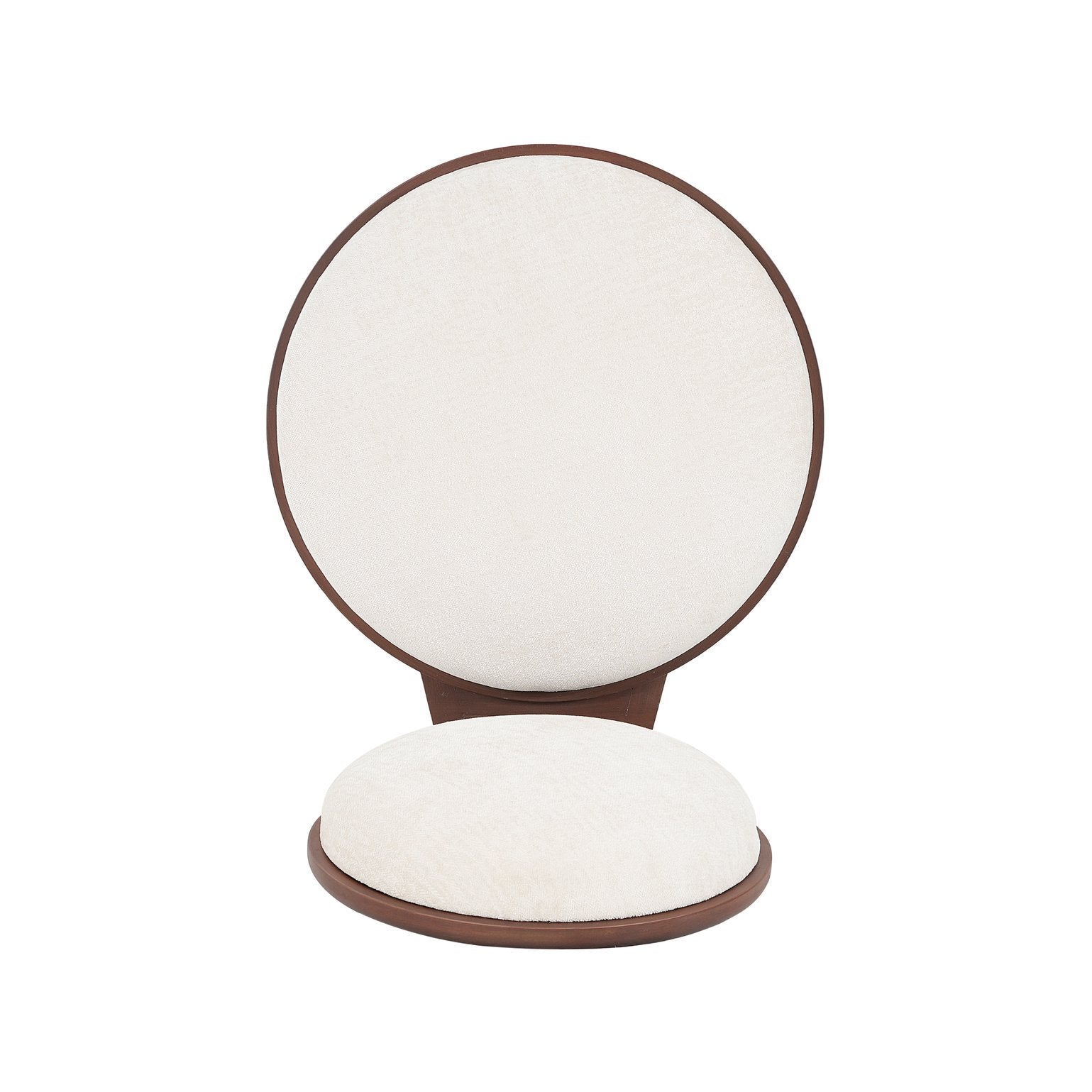 - Primary materials: Beige fabric upholstery with solid rubberwood frame in walnut finish
