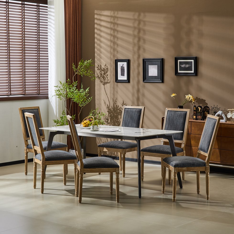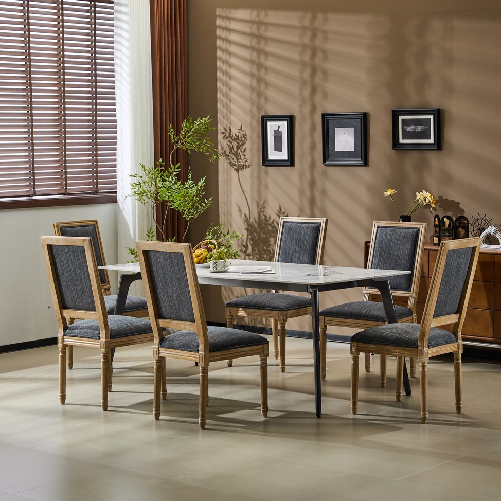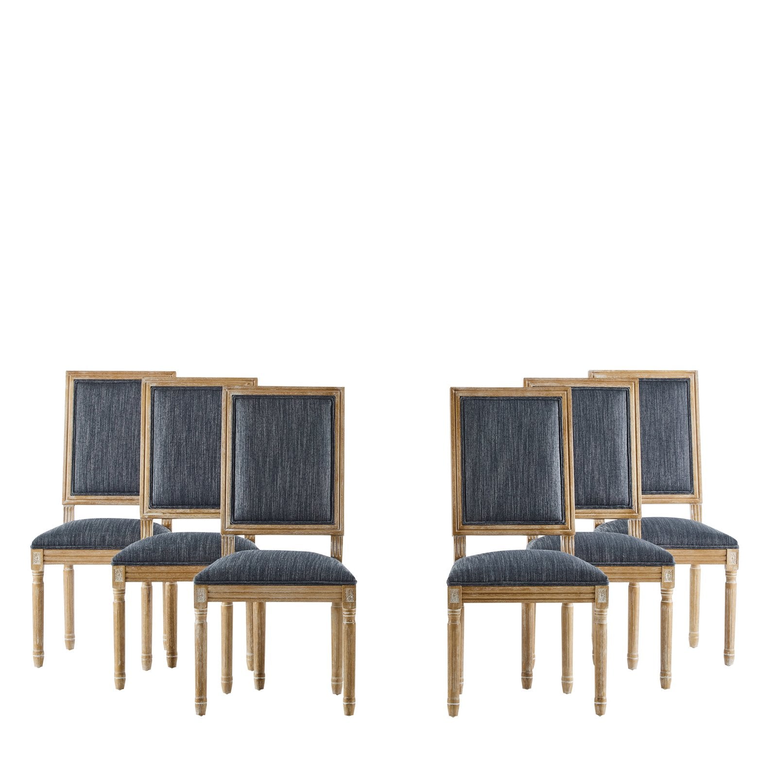Elevate your dining room with this set of six French country–inspired chairs that blend vintage charm with modern comfort. Each chair pairs a classic rectangular cane backrest and fluted legs with generous upholstered seating, finished in a weathered blue-gray that complements both rustic and contemporary interiors. Thoughtfully constructed from solid rubberwood, these chairs are designed for everyday use while delivering an elegant, cohesive look for family meals or formal gatherings.