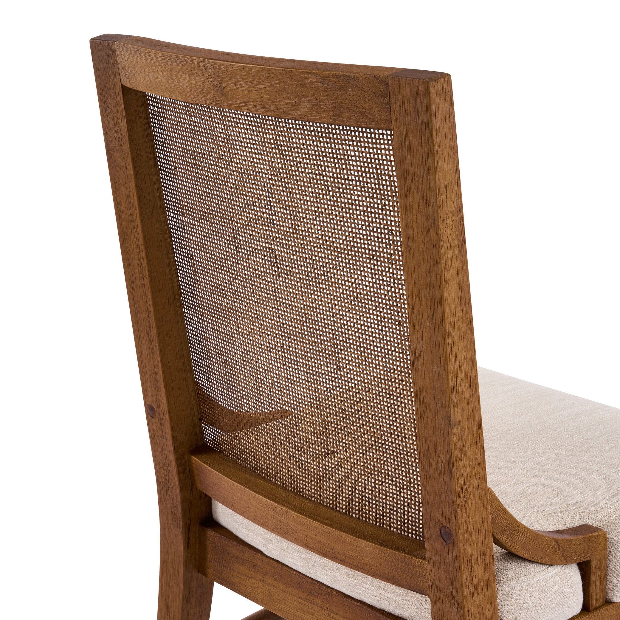 - Timeless dining chair with a natural cane backrest and cushioned fabric seat, showcasing elegant contrast between beige upholstery and walnut-finished wood.