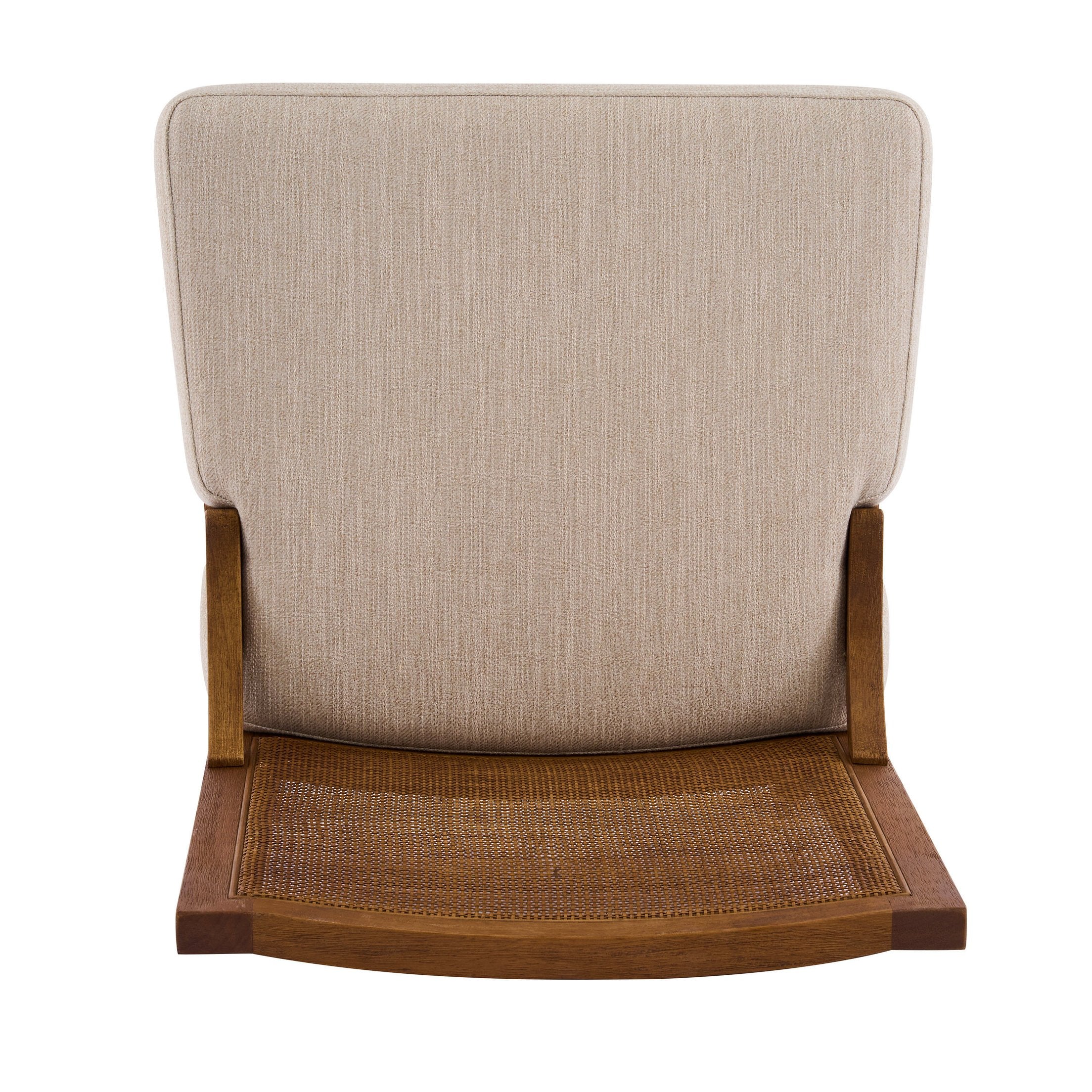 - Materials: Beige fabric upholstery over plywood seat; natural cane back; solid rubberwood legs with walnut finish