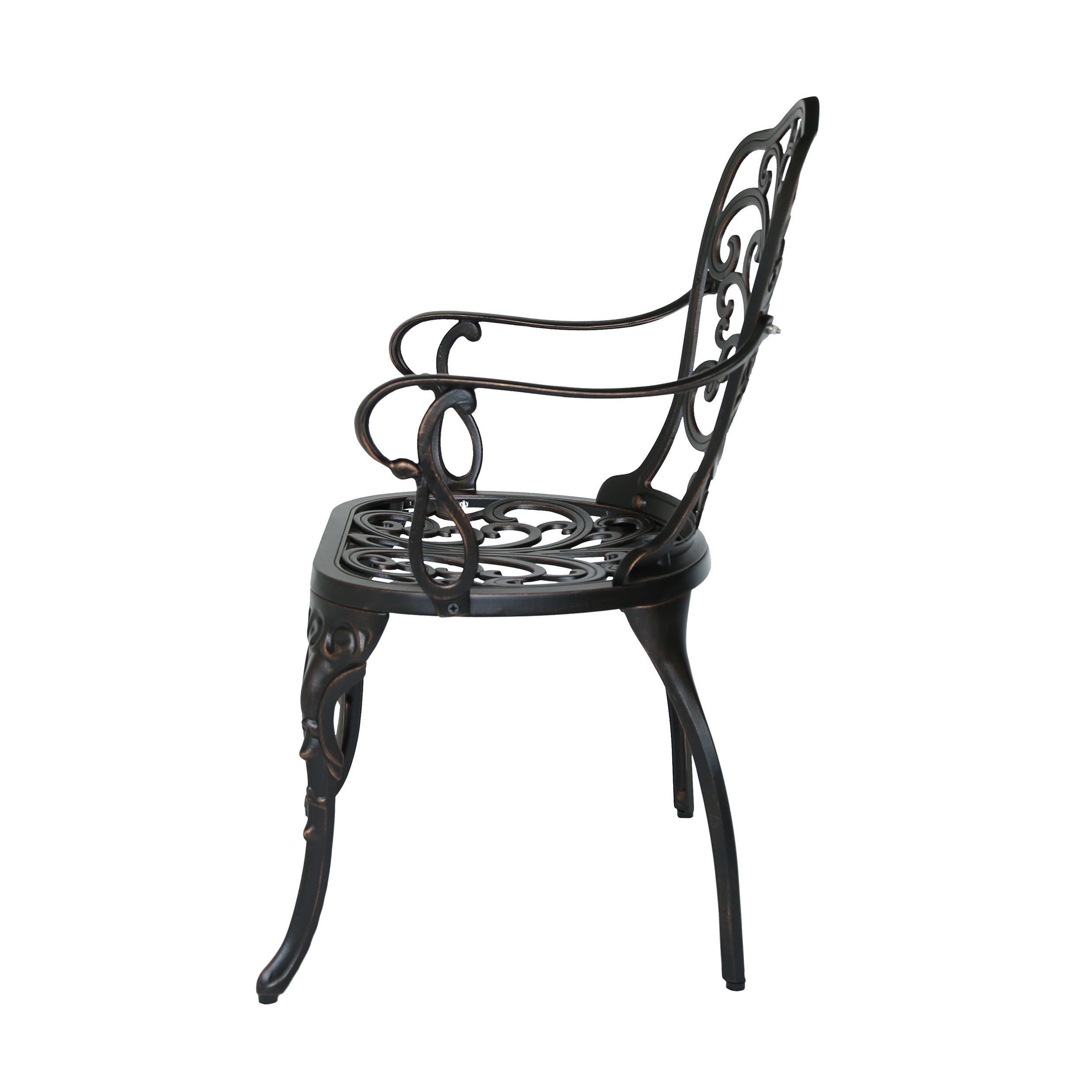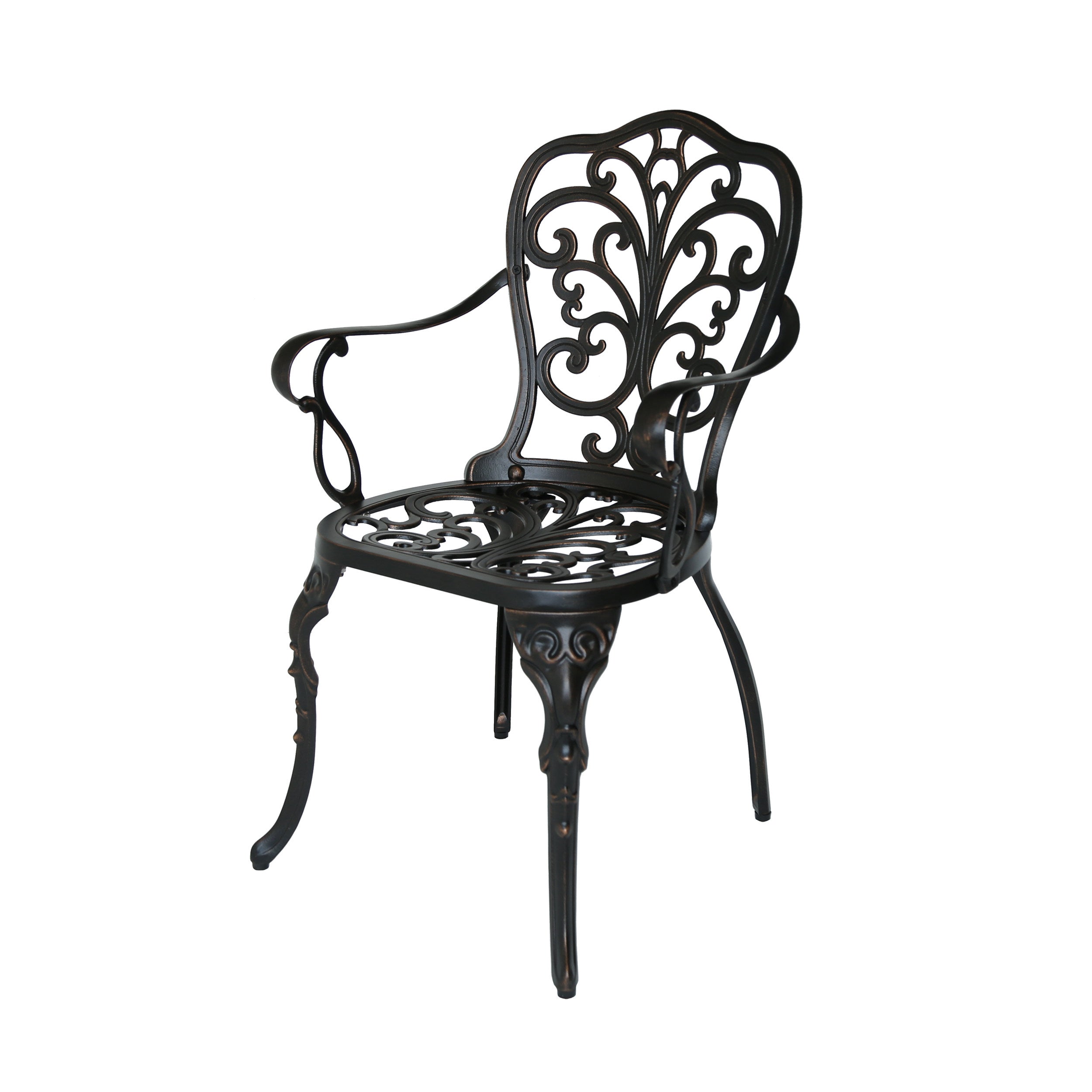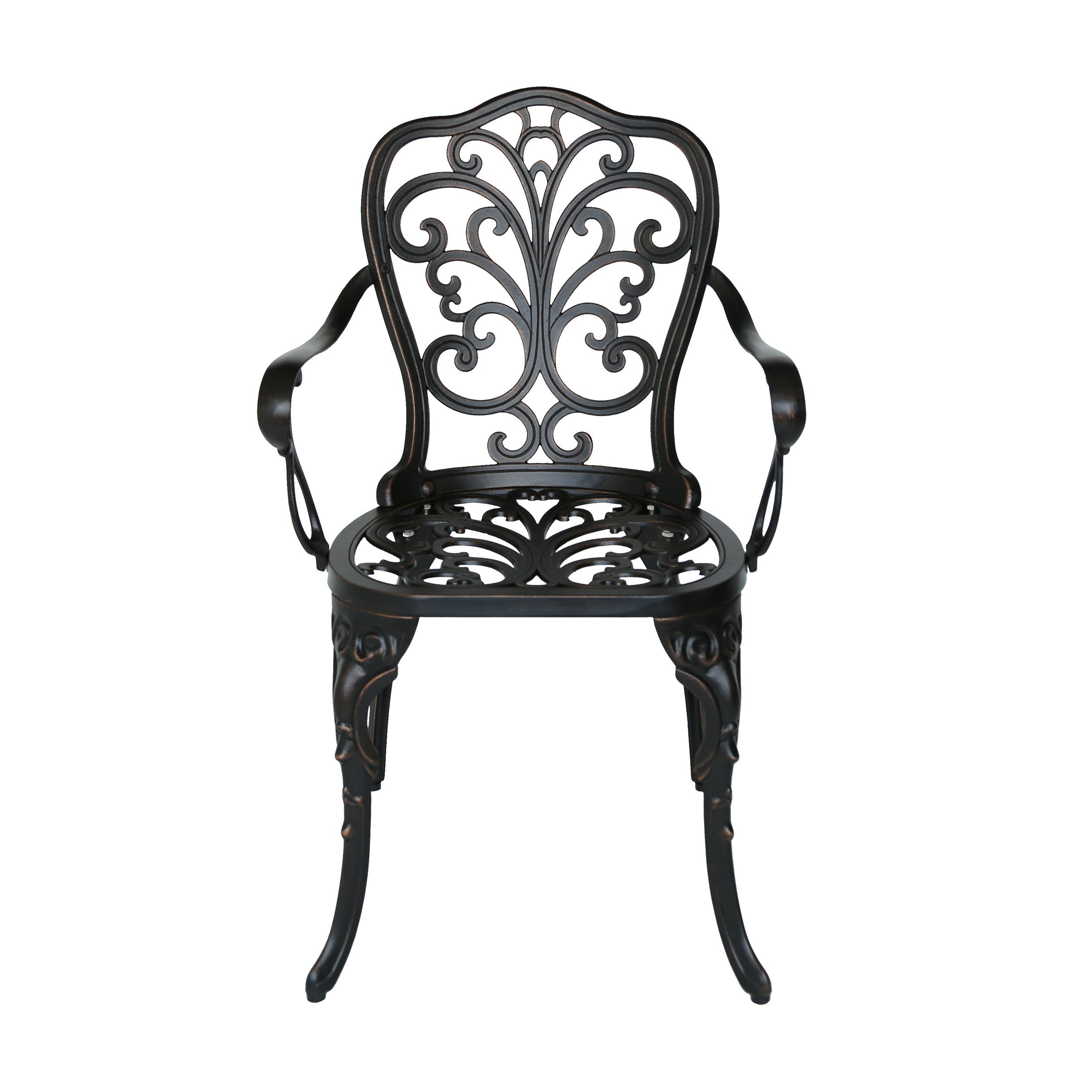 - Bring traditional style and sophistication to your patio or porch with this elegant outdoor dining chair! Crafted from cast aluminum in an antique oil-rubbed bronze finish, this chair strikes an ornate silhouette featuring an arched back, scrolling arms, and cabriole legs. Open scrollwork filigree lines the backrest and seat, letting the waterfall right through for quicker drying. Measuring 34.75" H x 22" W x 23" D overall, this chair has a 16.75" seat height and a 300 lbs. weight capacity.