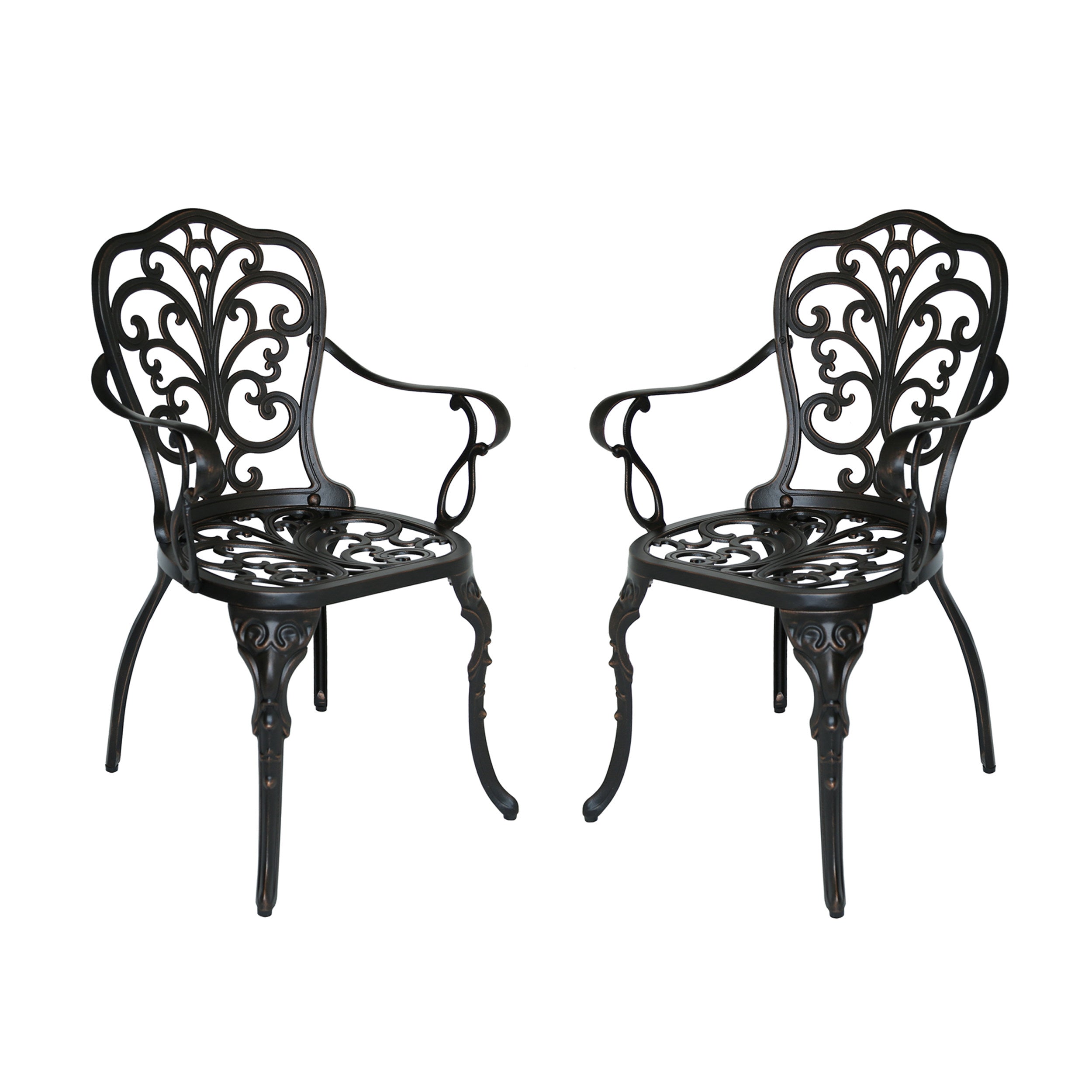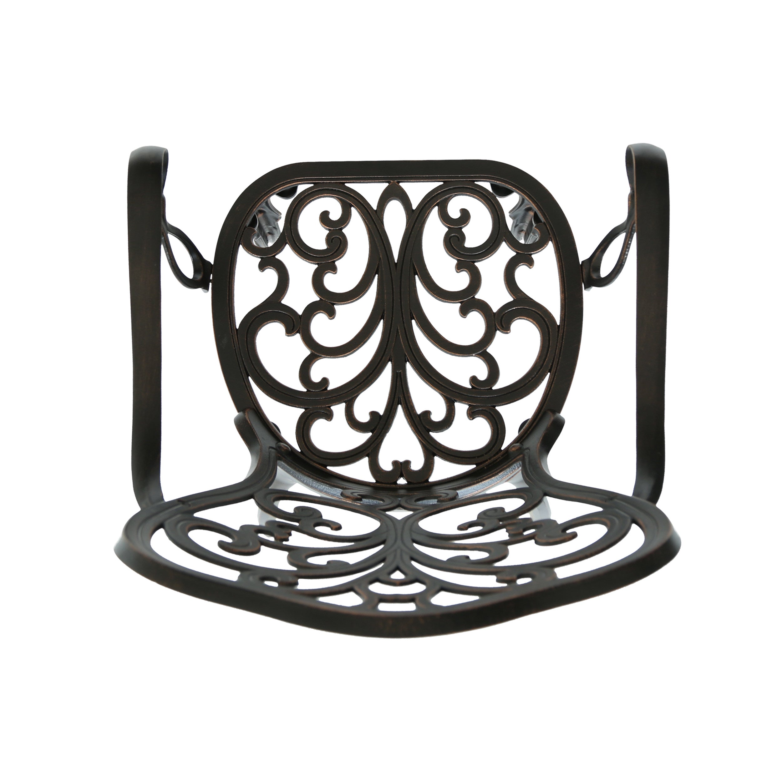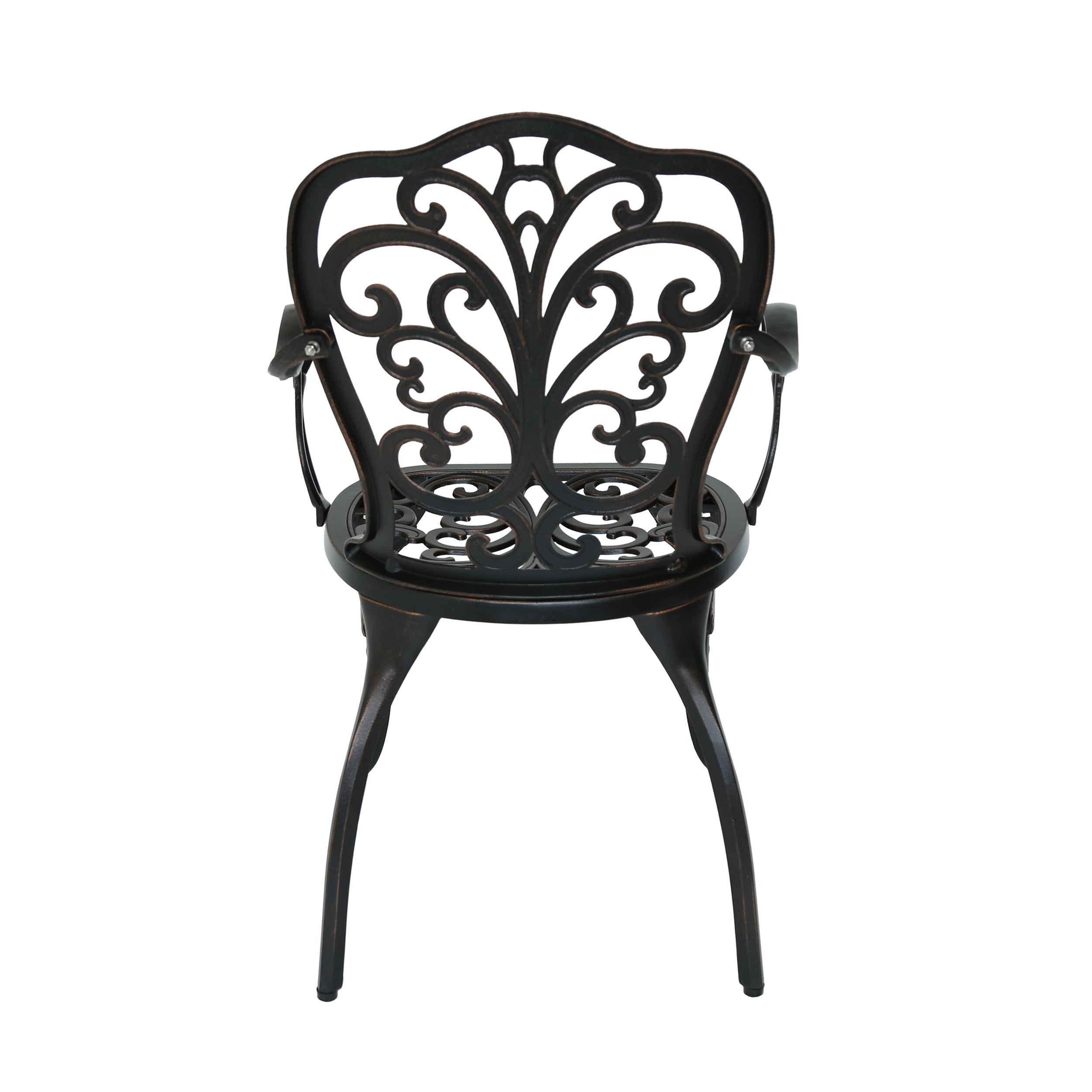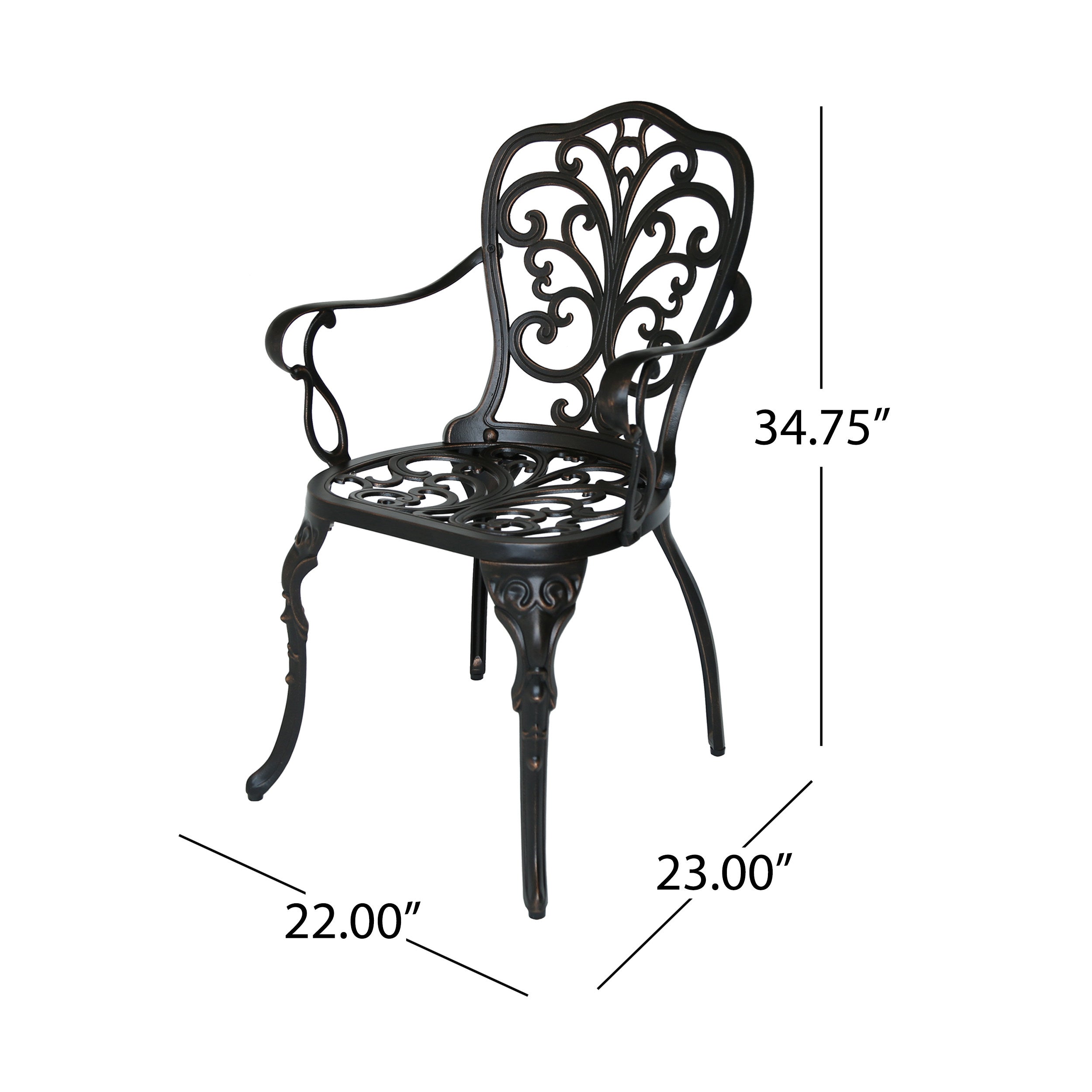 - Bring traditional style and sophistication to your patio or porch with this elegant outdoor dining chair! Crafted from cast aluminum in an antique oil-rubbed bronze finish, this chair strikes an ornate silhouette featuring an arched back, scrolling arms, and cabriole legs. Open scrollwork filigree lines the backrest and seat, letting the waterfall right through for quicker drying. Measuring 34.75" H x 22" W x 23" D overall, this chair has a 16.75" seat height and a 300 lbs. weight capacity.