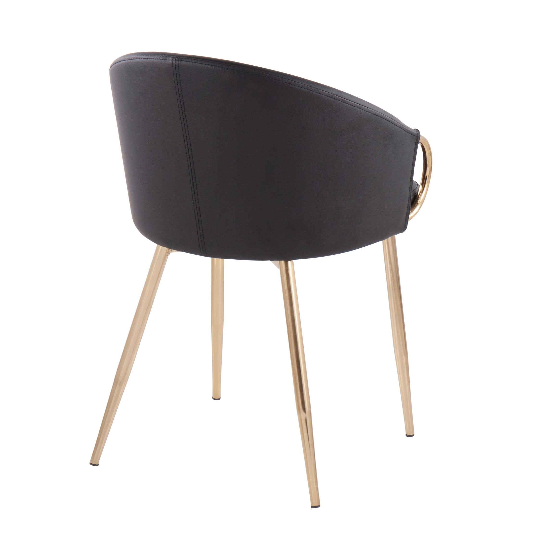 Elevate your dining or seating area with the Claire chair — a contemporary-glam accent that blends sleek black faux leather upholstery with a radiant gold metal frame for an instant style upgrade. Designed for comfort and visual impact, this pair brings a rounded low backrest, padded seating, and refined metallic detailing that fits modern, glam, and transitional interiors.