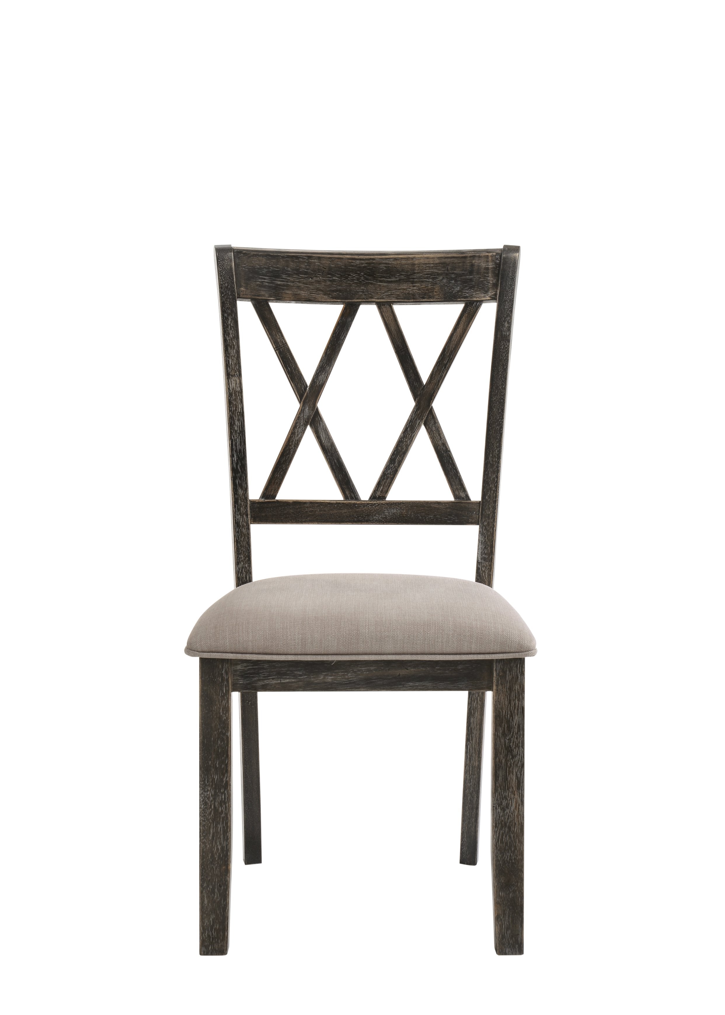 Invite classic elegance to your dining or living area with this refined set of two side chairs, blending a soft beige fabric seat with a weathered gray wood finish. The high-back, armless silhouette and distinctive "XX" backrest create a timeless look, while sturdy construction and comfortable upholstery make these chairs ideal for everyday use and extended gatherings.