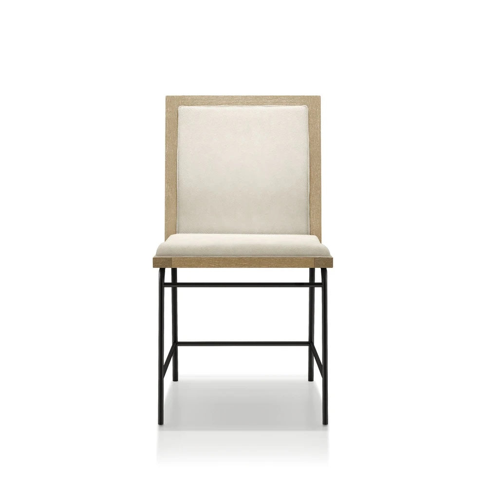 Bring modern warmth to your dining space with this set of two contemporary side chairs. Soft beige upholstery and solid-back seating create a clean, inviting look, while oak veneer accents and black metal legs add a refined contrast that suits kitchen nooks, dining rooms, or casual work corners. Designed for comfort and everyday use, these chairs balance style, durability, and easy assembly.