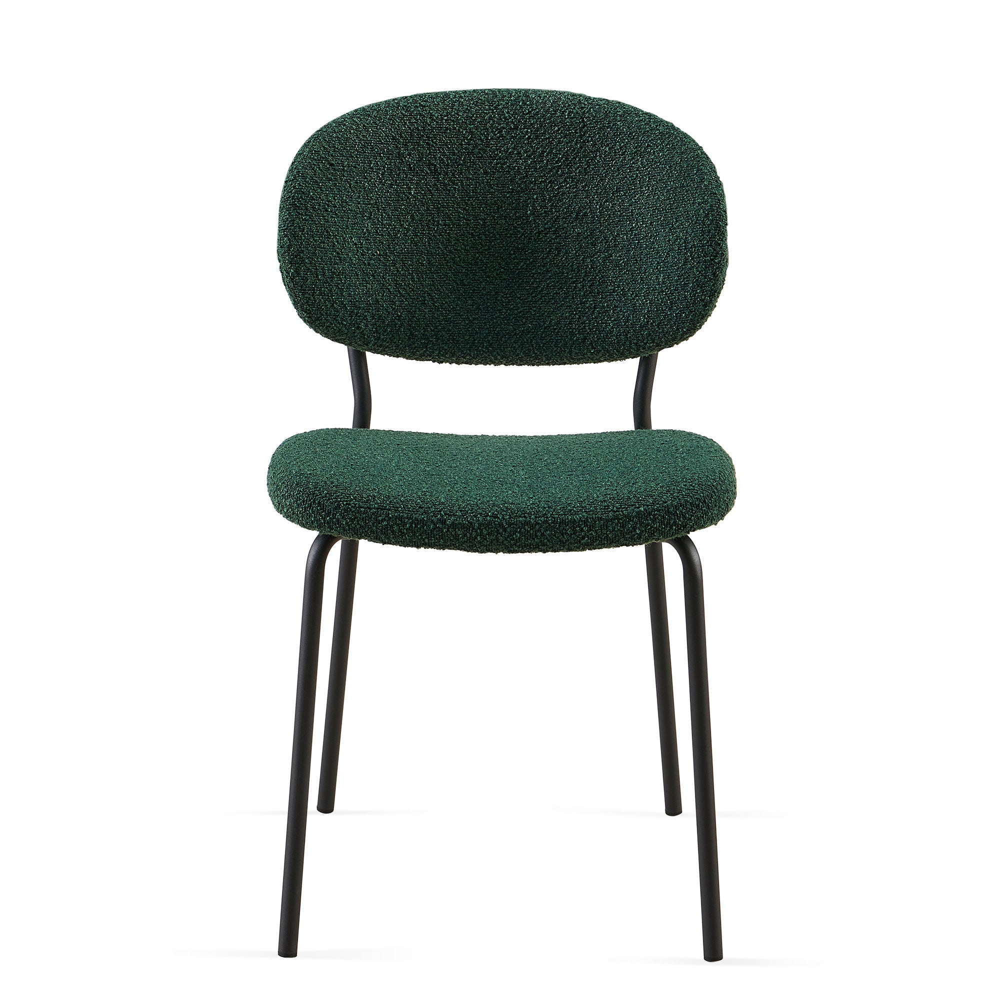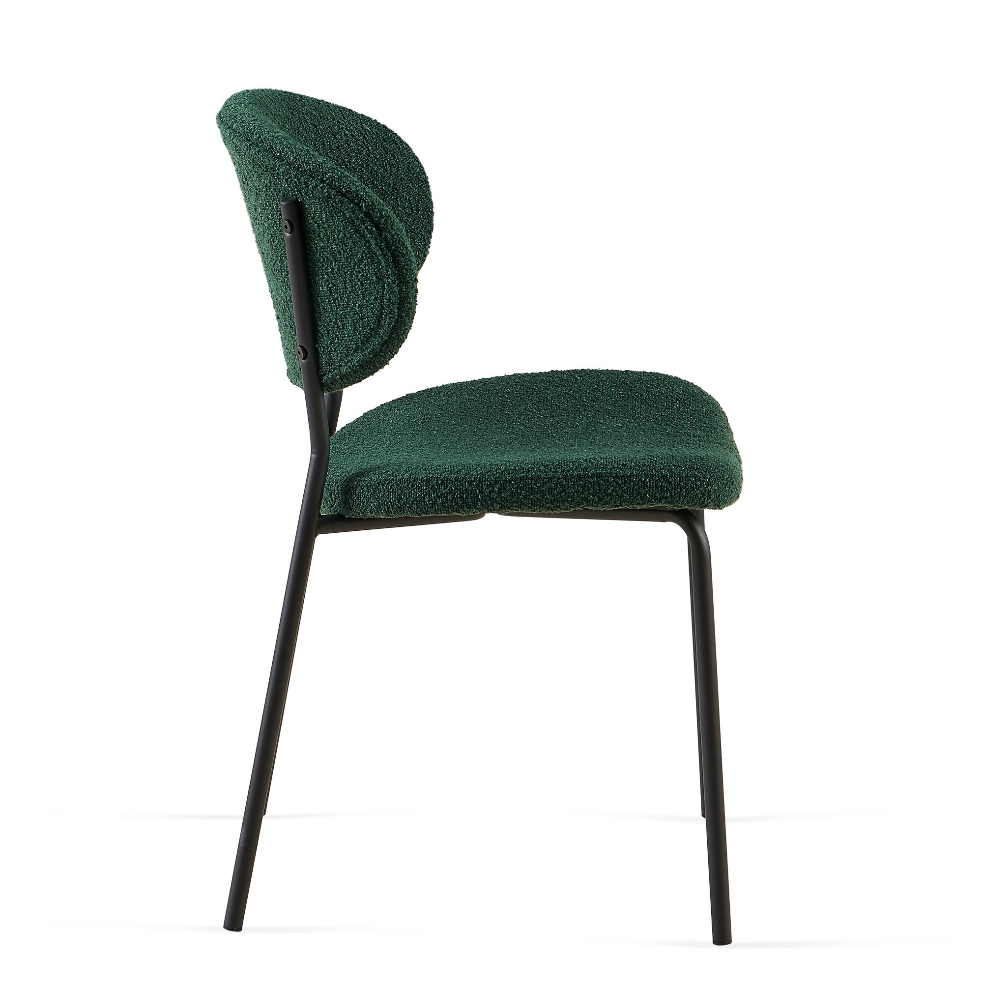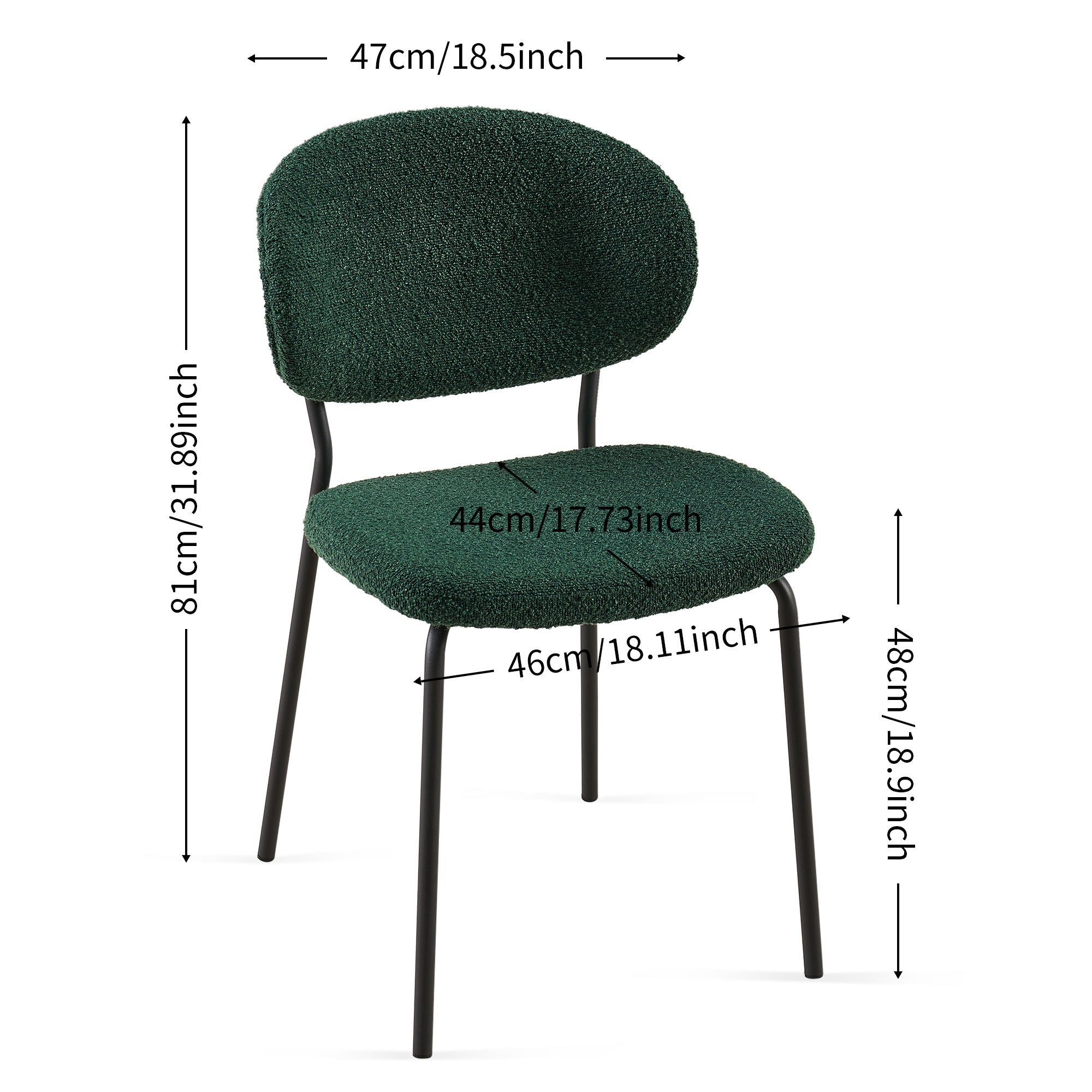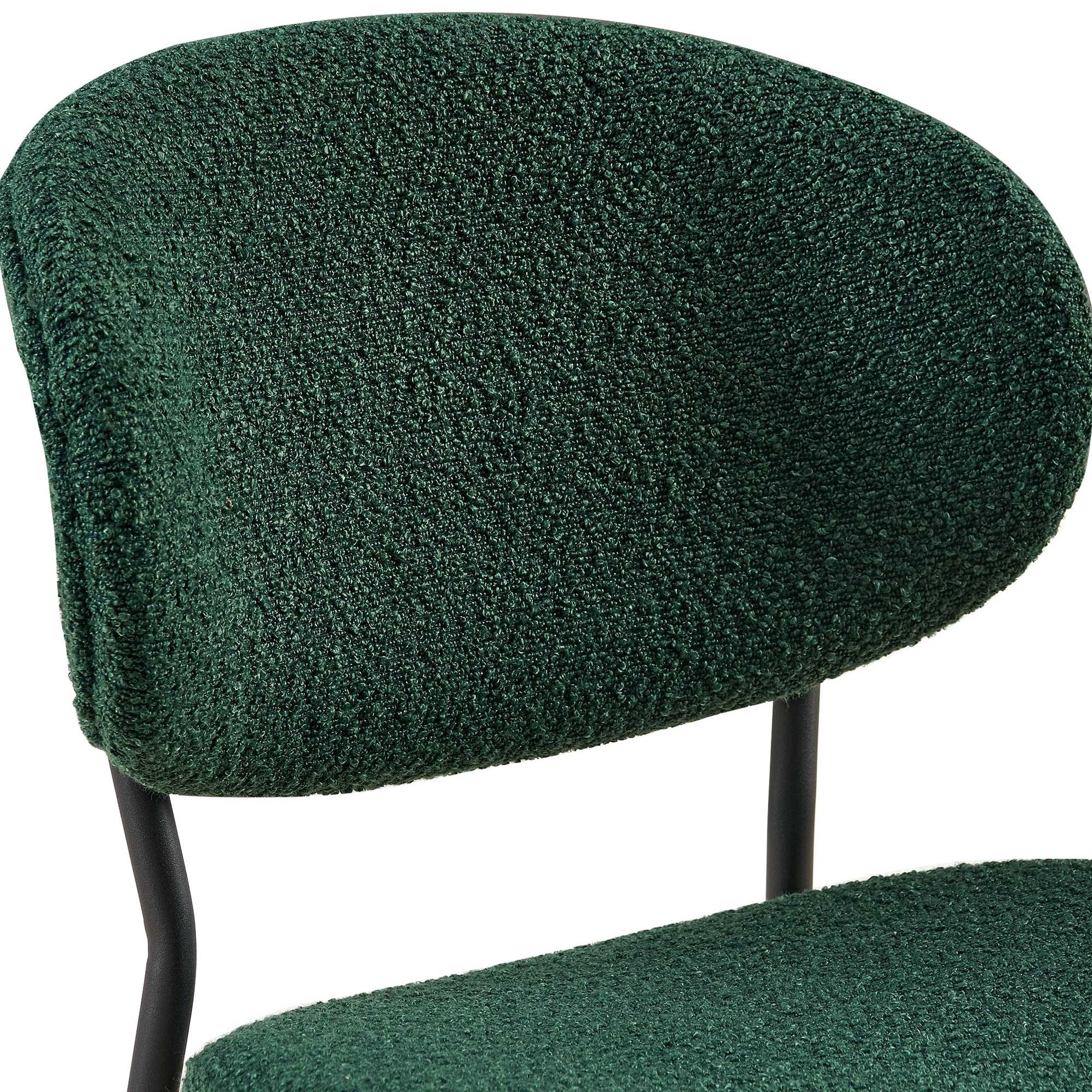 Elevate your dining space with this set of four mid-century modern dining chairs upholstered in rich dark green boucle fabric. Thoughtfully designed for comfort and style, these chairs pair a softly curved backrest with sleek black metal legs to create a refined silhouette that complements contemporary, Scandinavian, and minimalist interiors. Ideal for dining rooms, kitchens, breakfast nooks, or boutique hospitality settings, they deliver durable performance and a cozy seating experience.
