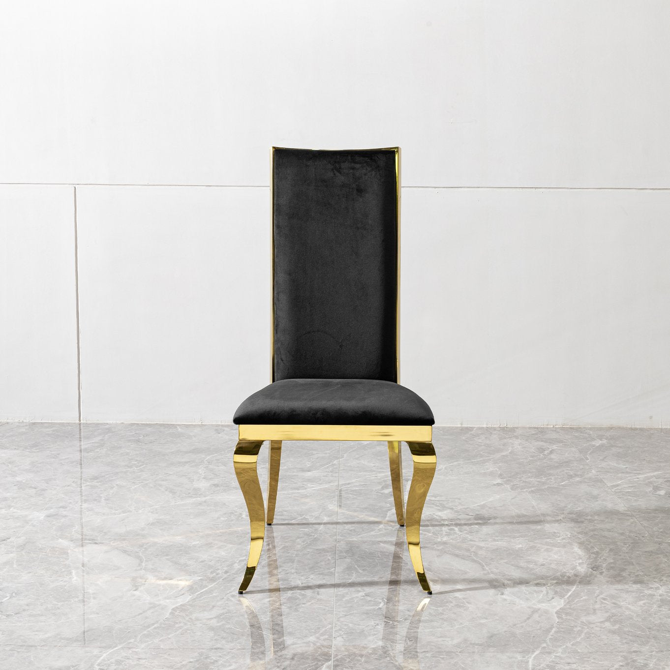 Elevate your dining space with a pair of sleek, modern chairs that combine luxurious black velvet comfort with striking mirror gold stainless steel legs and a sculptural, snake-like backrest. These chairs are designed to be both a visual focal point and a durable, easy-care seating solution for everyday use or special occasions.