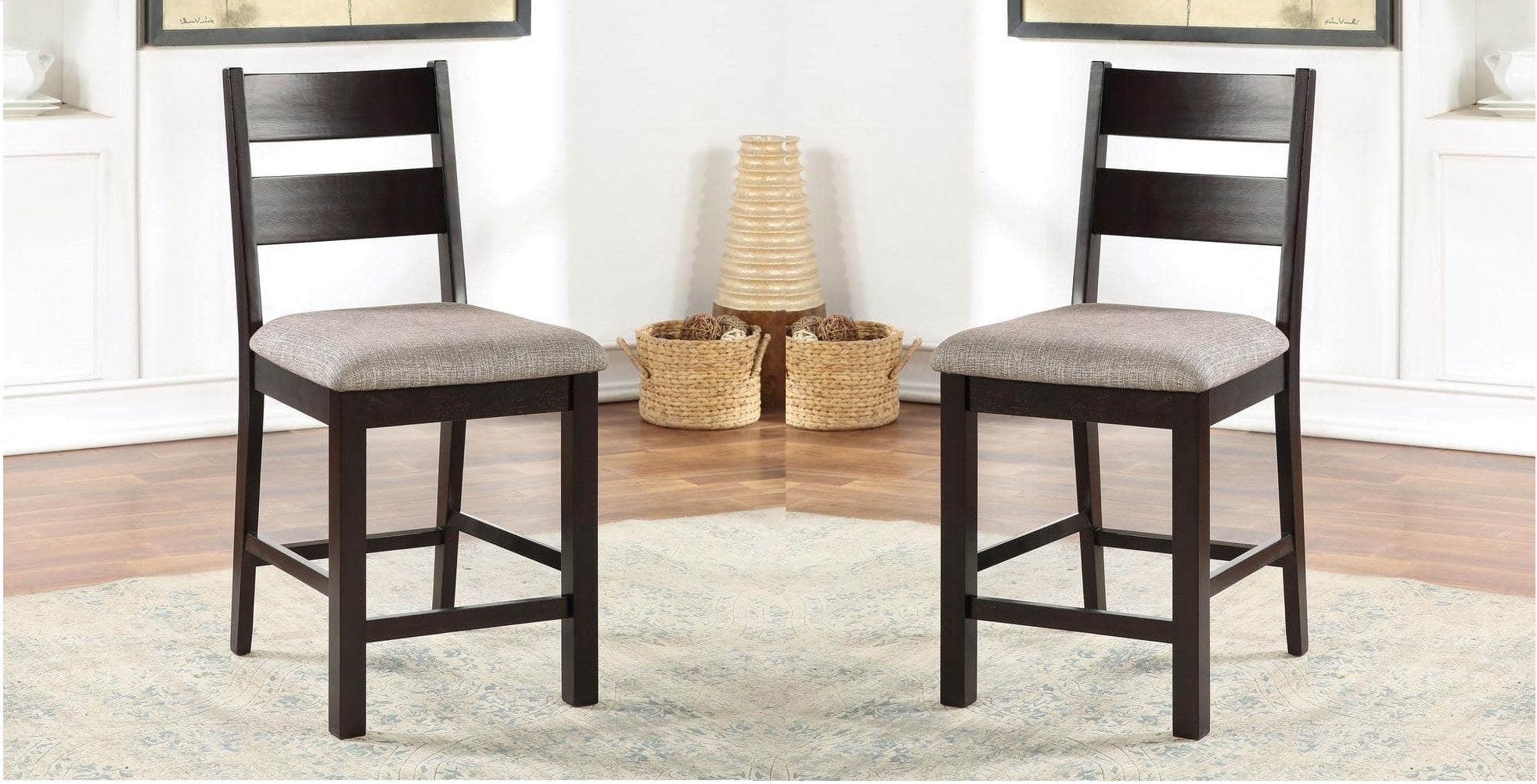 Upgrade your dining space with this stylish set of two ladder-back side chairs, combining a rich espresso frame with light gray, linen-like upholstered seats for a modern transitional look. These chairs offer comfortable, cushioned seating and sturdy construction—perfect for everyday dining, casual gatherings, or as accent seating in the kitchen or dining room.