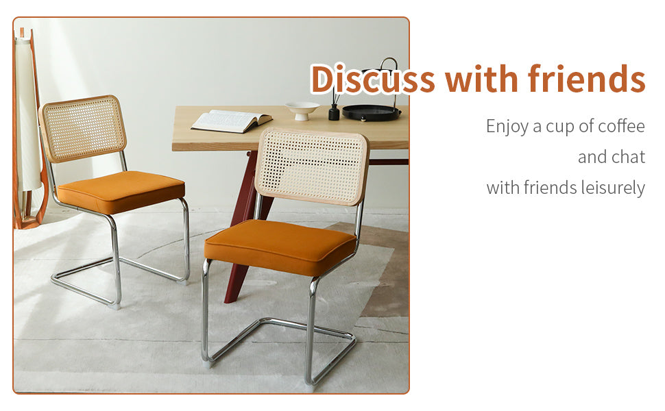 Bring mid-century modern elegance to your dining room, kitchen, or living space with this set of two velvet rattan side accent chairs. Combining a sculptural chrome cantilever frame with a breathable hand-woven rattan back and plush velvet seat, these chairs deliver striking visual appeal, comfortable seating, and durable construction—ideal for everyday use or entertaining.