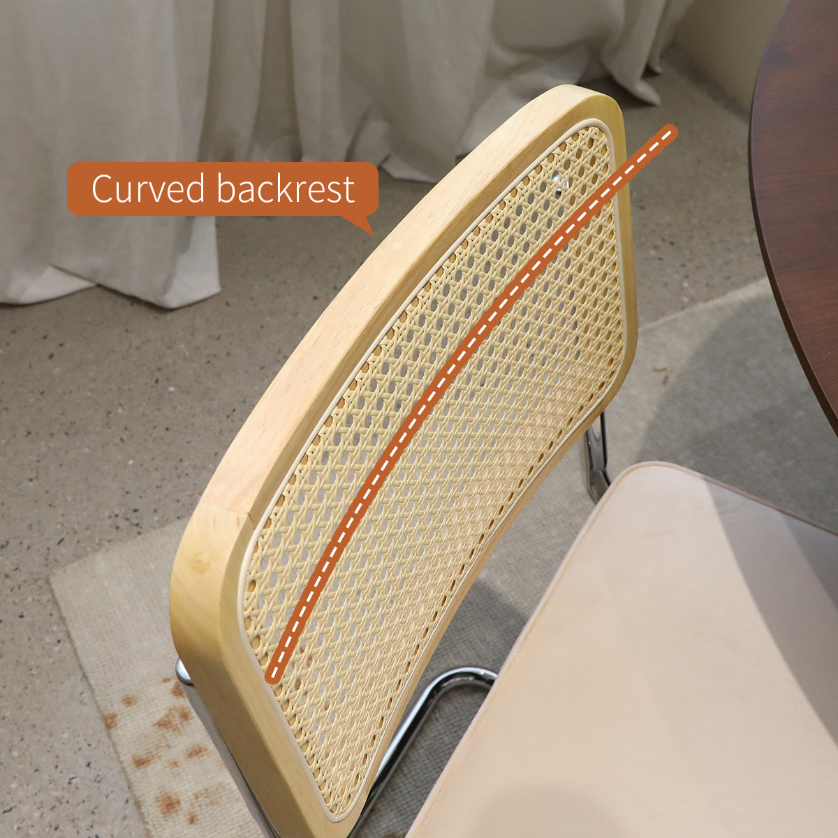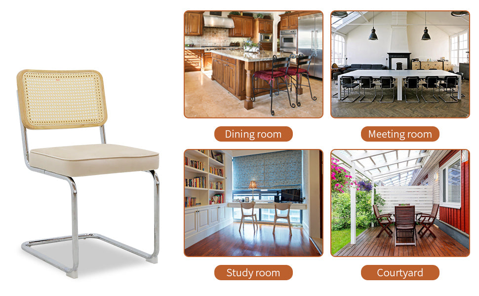 Bring mid-century modern elegance and everyday comfort to your home with this set of two velvet rattan side accent chairs. Combining a sleek chrome cantilever frame, hand-woven rattan back, and plush velvet seat, these chairs offer a stylish focal point for dining rooms, kitchens, living areas, or reception spaces. Thoughtful construction and breathable materials make them both attractive and practical for daily use.