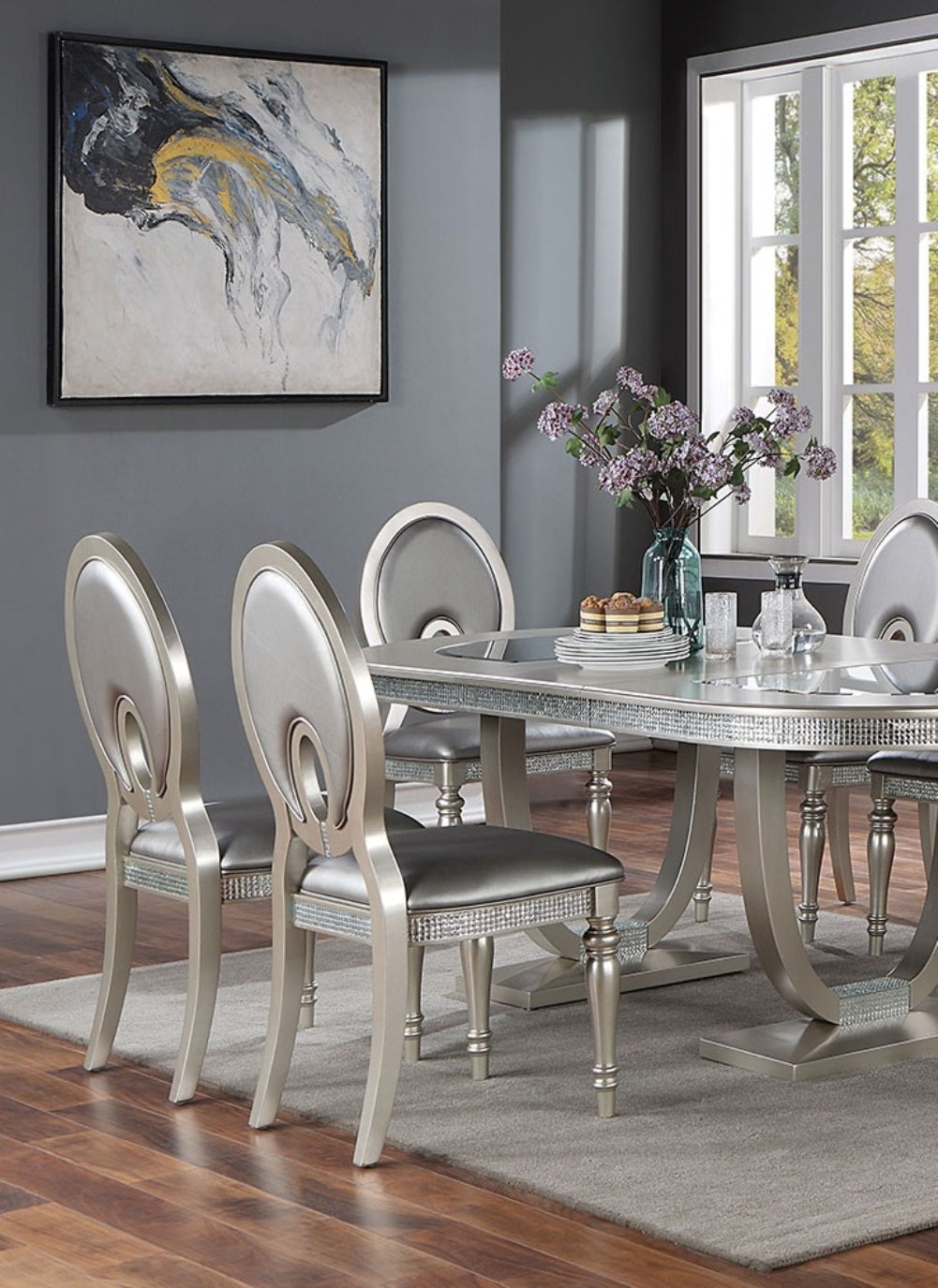 Elevate your dining space with this elegant 2-piece set of side chairs, featuring a contemporary transitional silhouette, reflective mirror-tile accents, and metallic silver finish. Thoughtfully designed for both style and comfort, these chairs pair graceful turned legs and a round keyhole back with leatherette-upholstered seats for a polished, cohesive look that complements modern and transitional dining rooms.