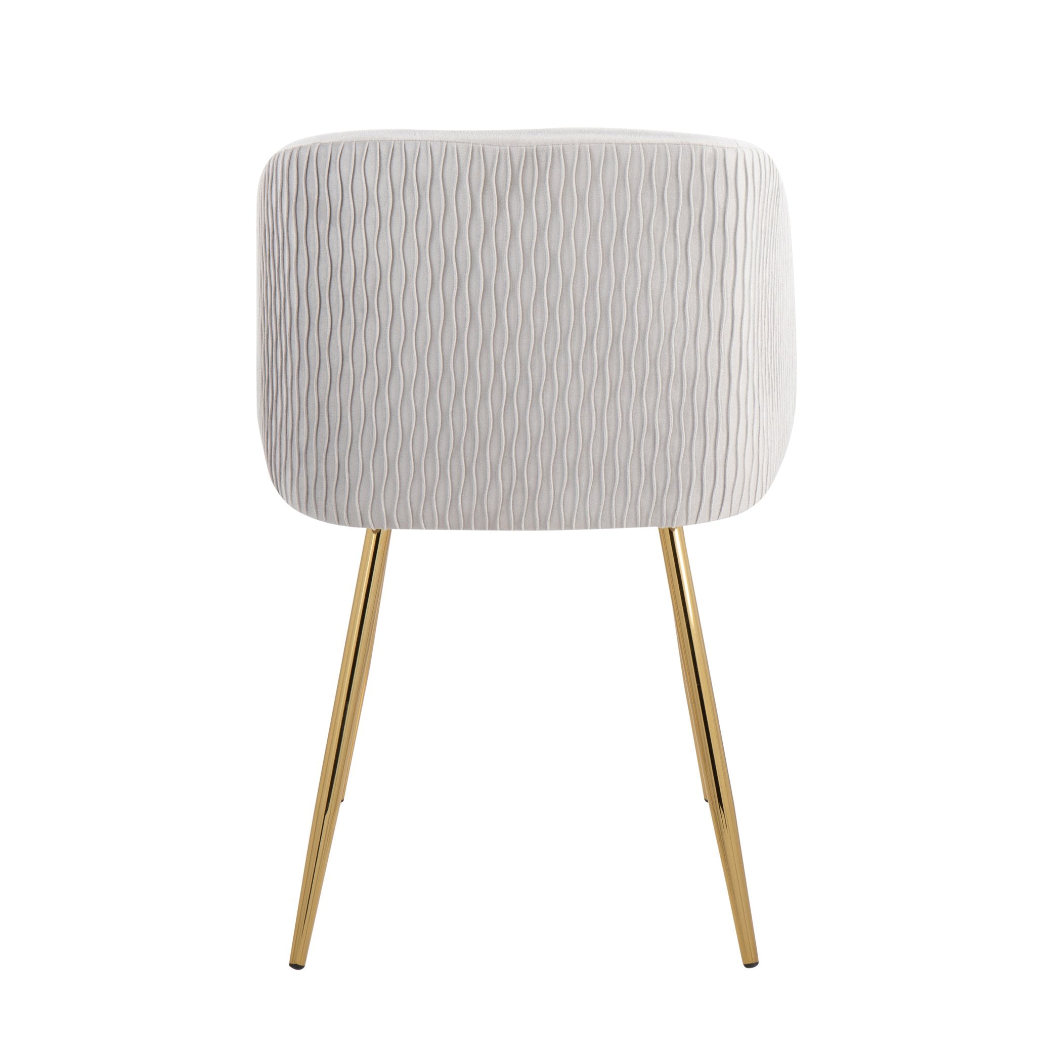 Elevate your dining or accent seating with the Fran Pleated Waves Chair — a modern, elegant piece that blends plush comfort with sculptural design. The striking pleated wave back, wrapped in soft silver velvet, and the gold-finished metal legs create a luxe contrast that suits contemporary and transitional interiors. Built for everyday use, this set of two chairs offers supportive bucket-style seating and a compact footprint that fits dining rooms, kitchens, home offices, or vanity areas.