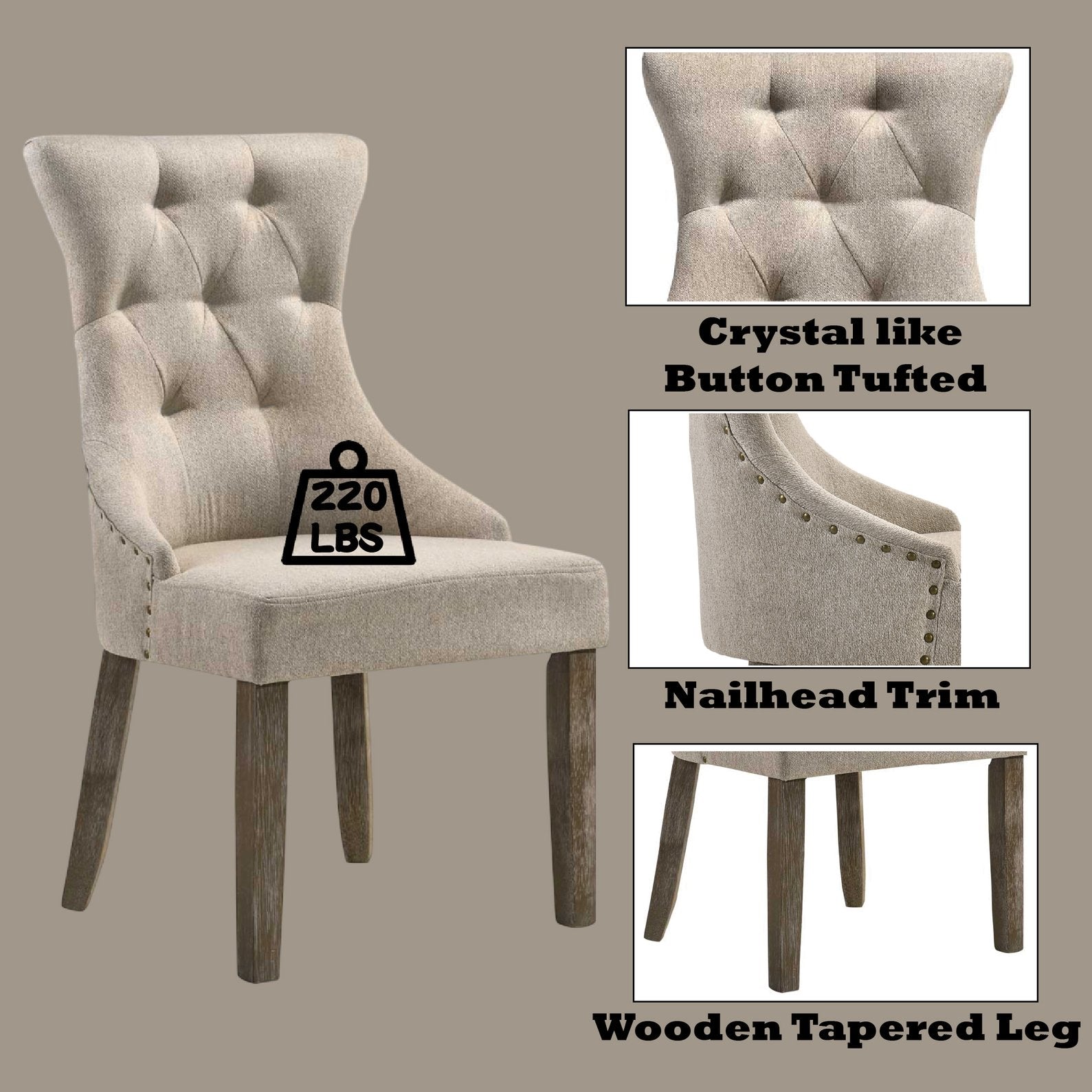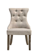 Elevate your dining or seating area with these stylish two-tone side chairs that blend contemporary upholstery with reclaimed gray finish wood accents. Designed for comfort and visual appeal, this set of two chairs pairs a tall, padded back and cushioned seat with classic turned legs and durable construction—making them ideal for everyday use or special gatherings.