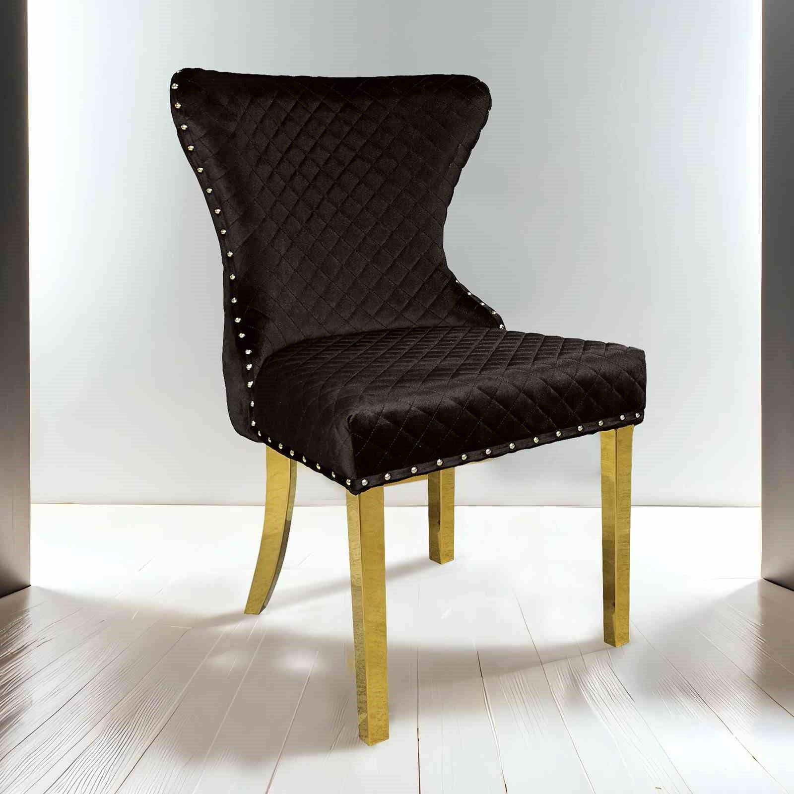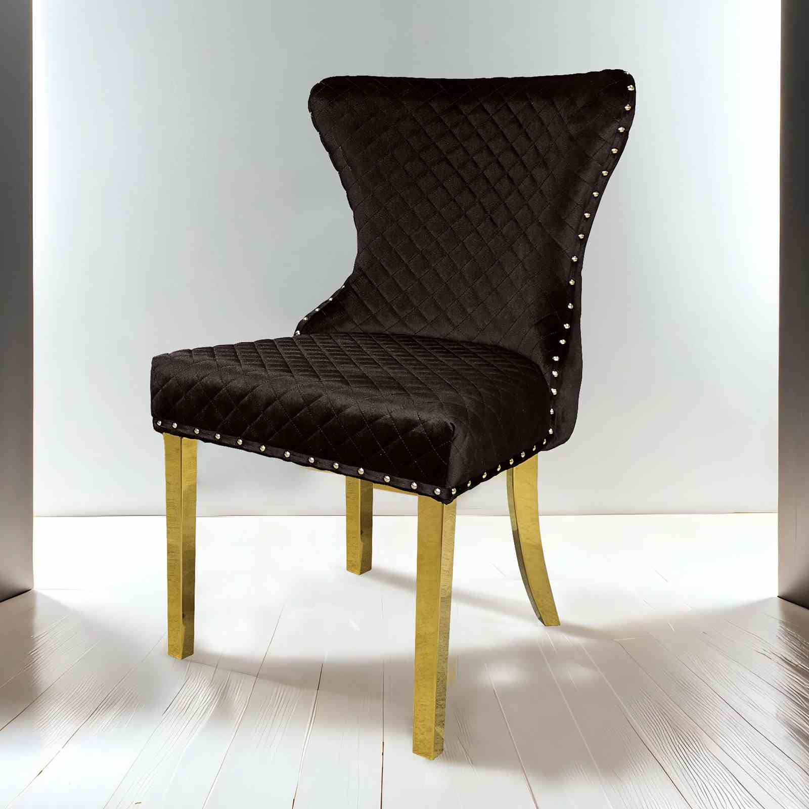 Elevate your dining or seating area with a chic, contemporary side chair that blends glam details with everyday comfort. Finished in sophisticated black and accented with gold square legs, diamond-pattern tufting, and nailhead trim, this chair makes a bold yet refined statement in dining rooms, offices, or hospitality settings. Designed for versatility and easy upkeep, it delivers both visual appeal and practical performance.