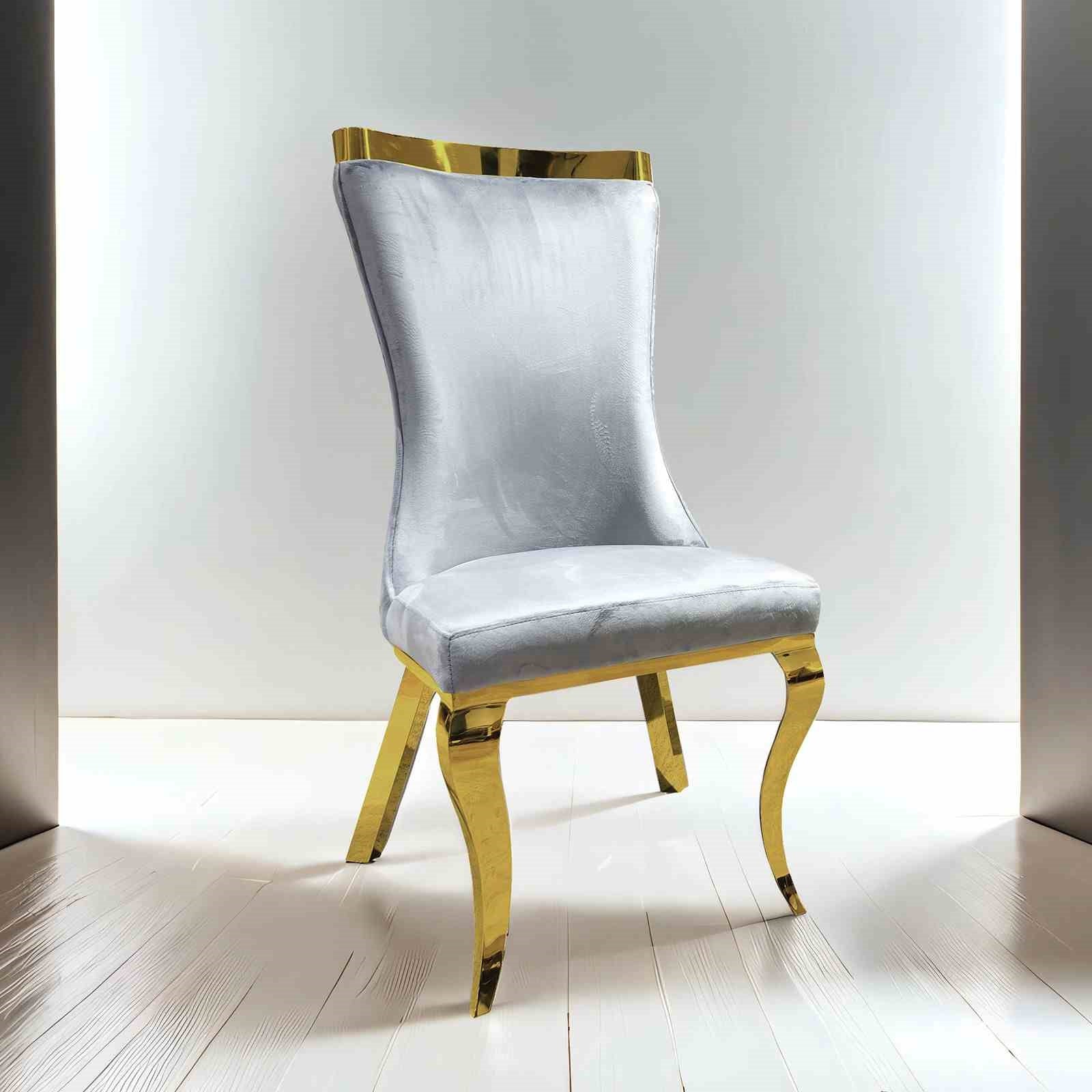Elevate your dining or office space with these glam-style side chairs that combine contemporary simplicity with luxe details. Upholstered in soft gray leather-look material and supported by gold-finished legs, each chair offers a comfortable seating profile and a refined silhouette that complements modern, transitional, and glam interiors. Durable yet lightweight construction makes them easy to move and suitable for everyday use in dining rooms, meeting areas, or reception spaces.