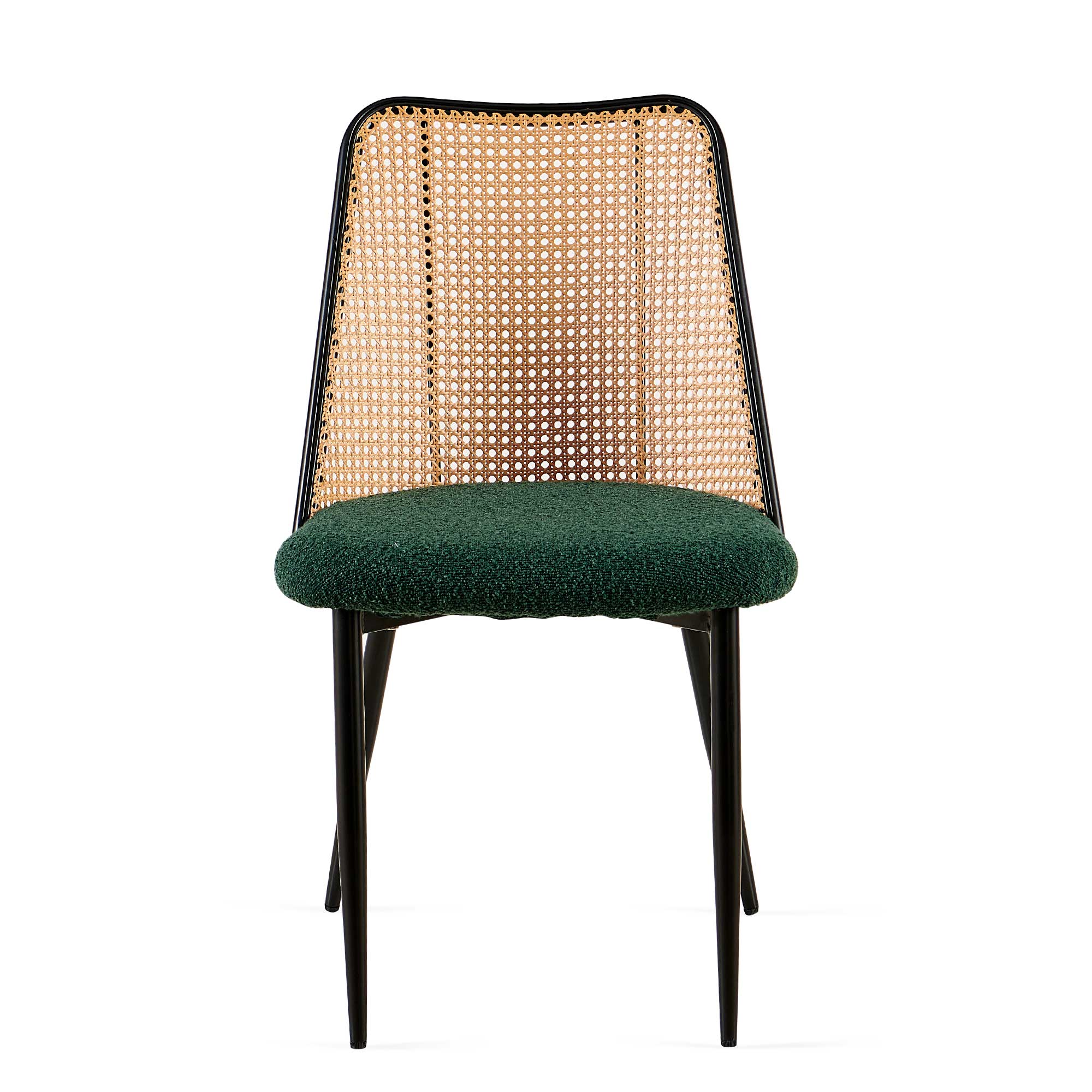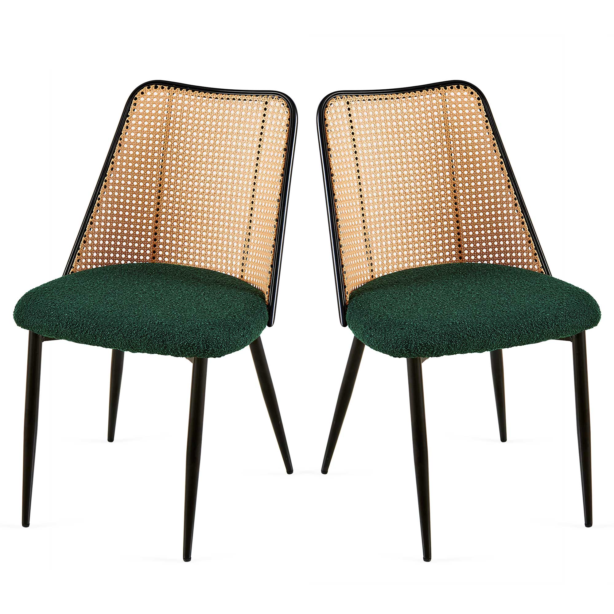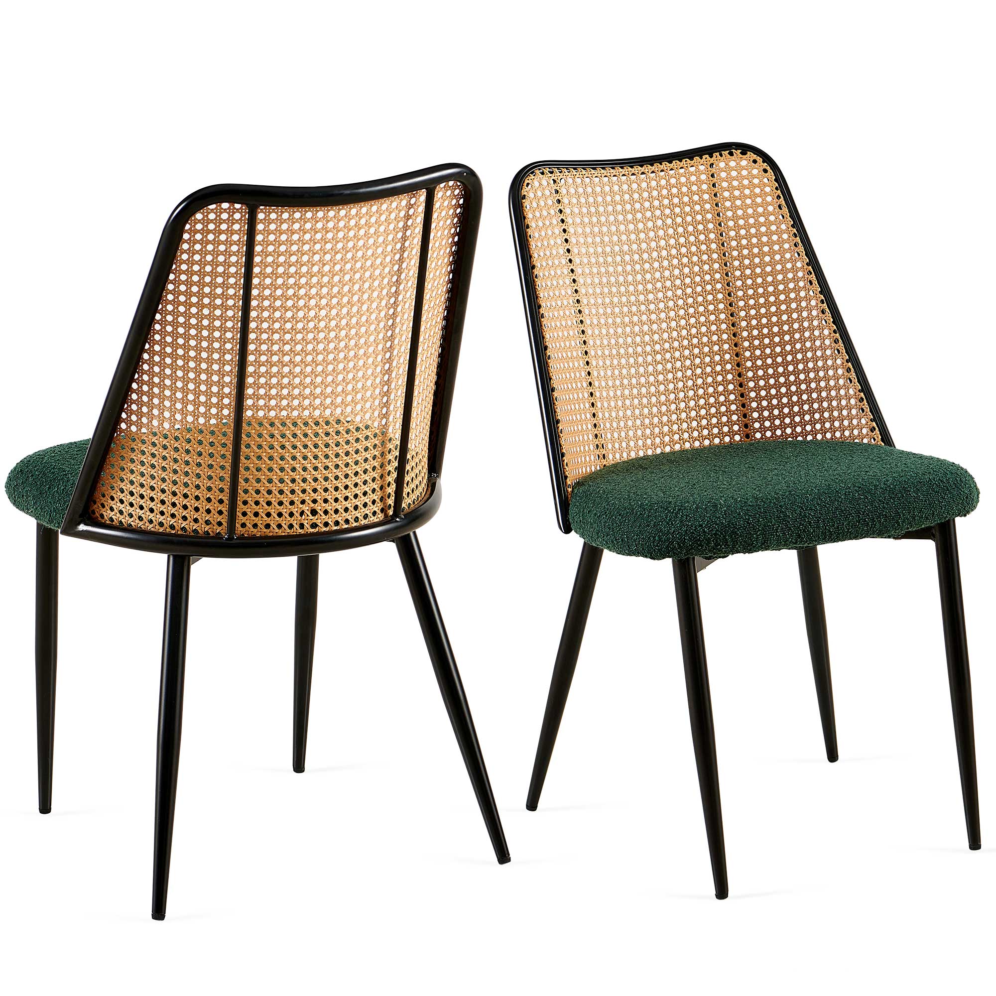 These stylish green rattan dining chairs combine mid-century charm with modern comfort—perfect for dining rooms, kitchens, or casual seating areas. Hand‑woven rattan and a boucle‑style upholstered seat create a warm, textured look while high‑density foam and sturdy metal legs deliver everyday comfort and reliable support.