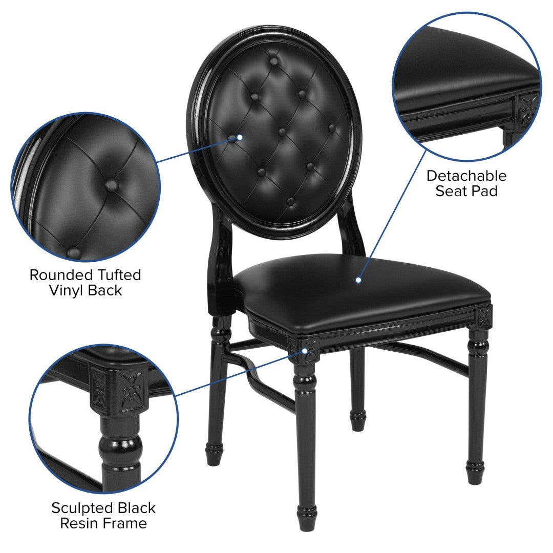 Elevate any room or event with this stately King Louis chair — a refined blend of classic styling and commercial-grade durability. Its sculpted silhouette, button-tufted rounded back and fluted legs create an elegant focal point for dining rooms, banquet halls, offices or special events, while the resilient resin construction and removable vinyl seat ensure years of dependable use.