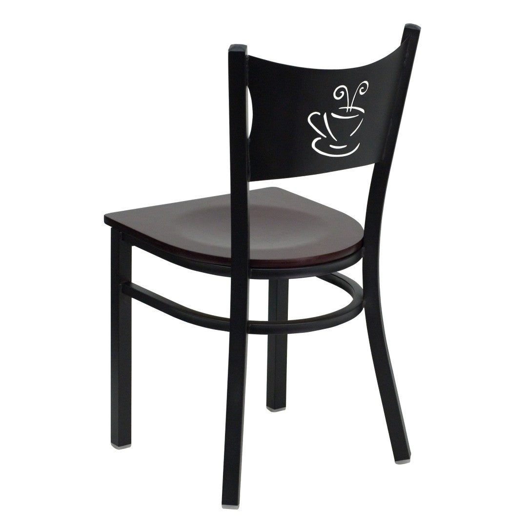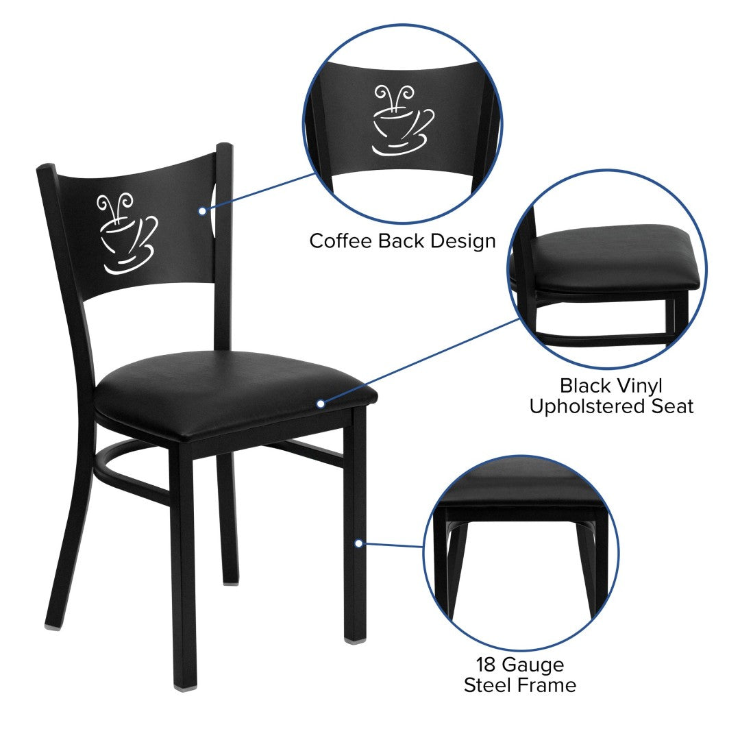 Give patrons a stylish, comfortable place to sit with this sturdy metal restaurant chair. Its distinctive coffee-back silhouette paired with a black vinyl upholstered seat brings a modern yet timeless look to cafés, bistros, banquet rooms, and contemporary homes. Built for daily commercial use, the chair combines durable construction and easy maintenance with thoughtful comfort features so it performs well in high-traffic environments while still enhancing your décor.