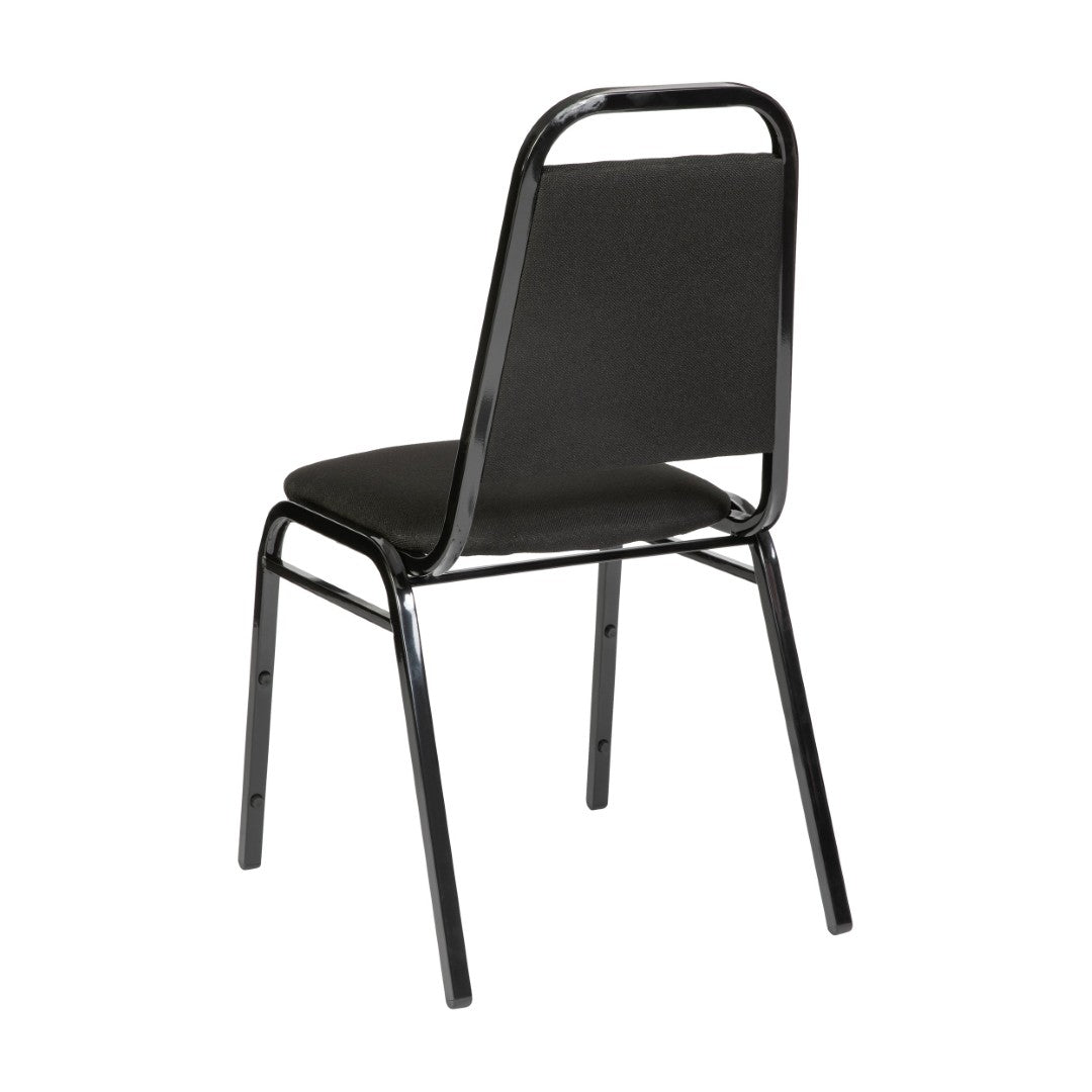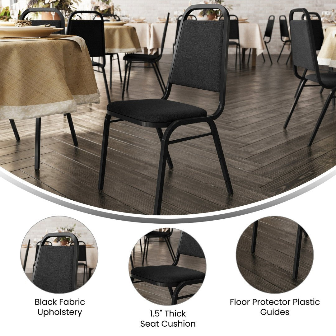 Stylish, heavy-duty and designed for high-volume use, this trapezoidal-back banquet chair delivers comfort, durability and stackable convenience for venues and rental businesses. Upholstered in black fabric with a seamless back panel and a generous 1.5" CAL-117 fire-retardant foam seat, it dresses easily for both casual gatherings and formal events. Built on a reinforced 16-gauge steel frame with bumper guards and non-marring glides, the chair withstands repeated setup, transport and stacking while protecting floors and finishes.