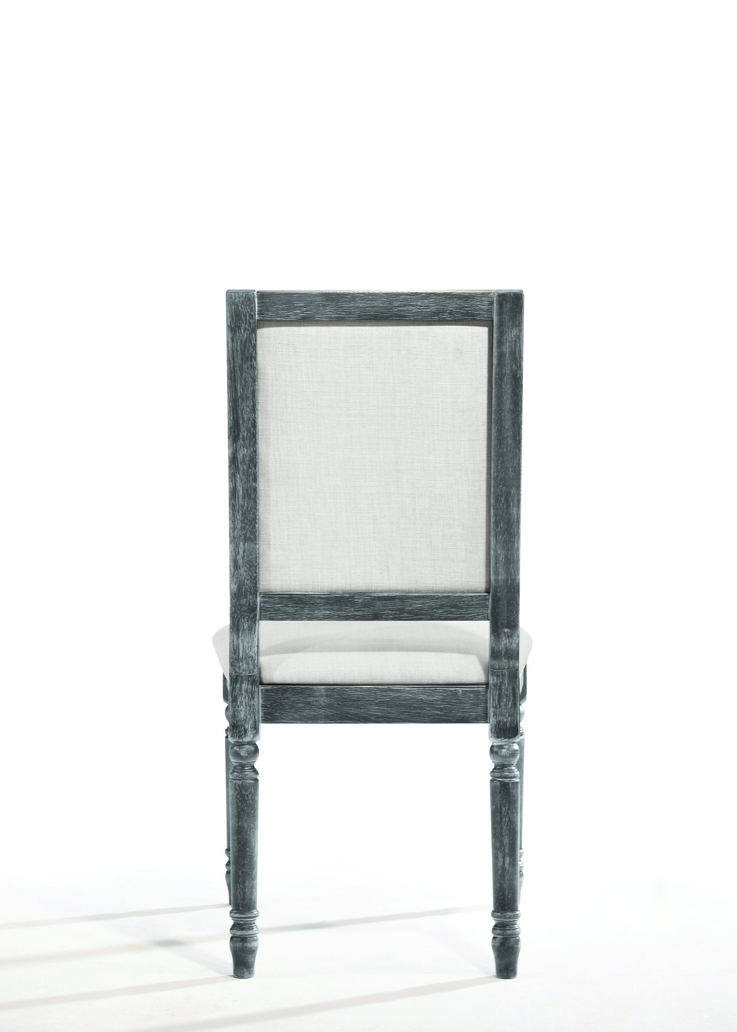 - Color & Finish: Cream linen upholstery with a weathered gray wood finish