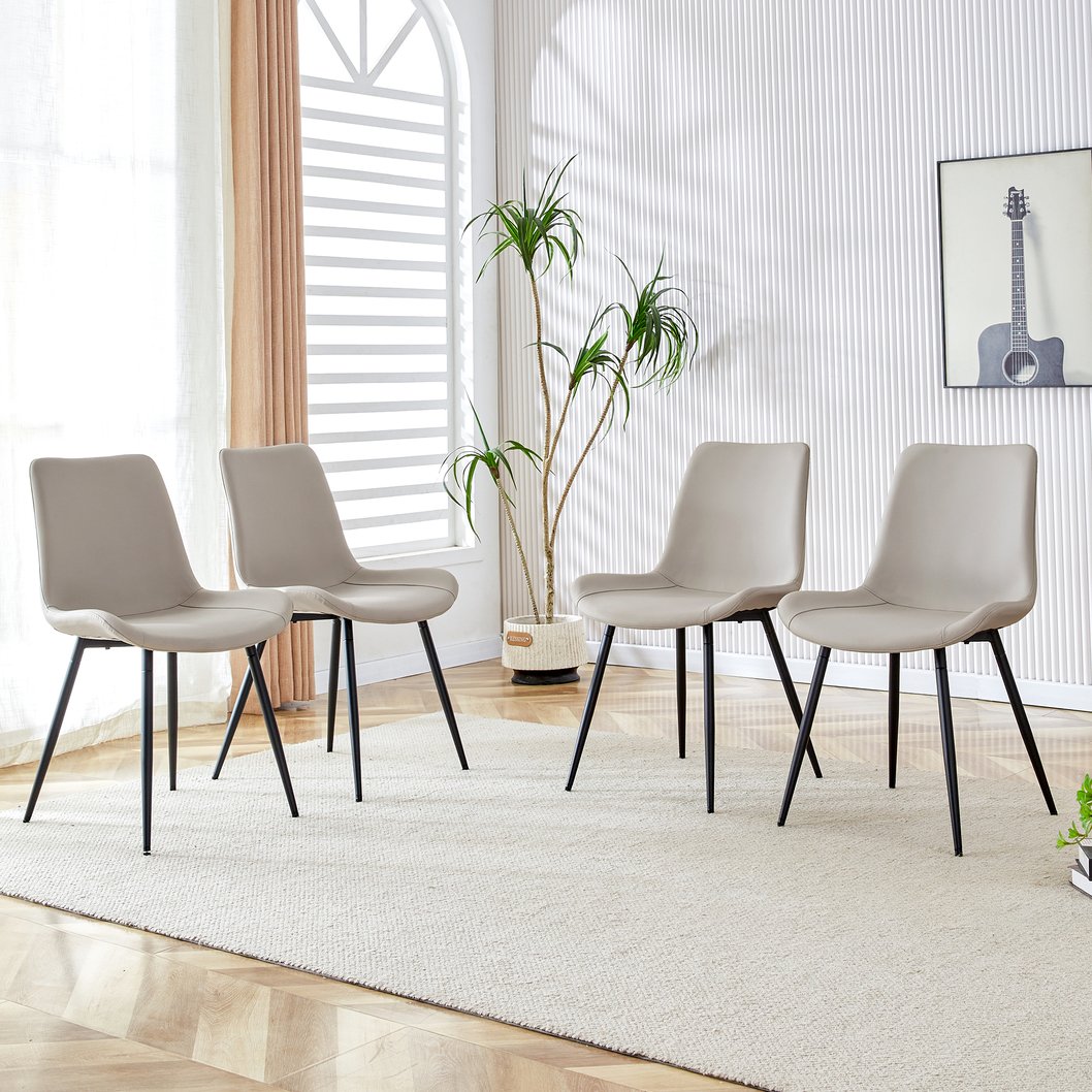 - Light gray artificial leather backrest cushion dining chair, black metal legs, curved widened cushion design for more comfort, suitable for restaurants, kitchens, bedrooms, offices.