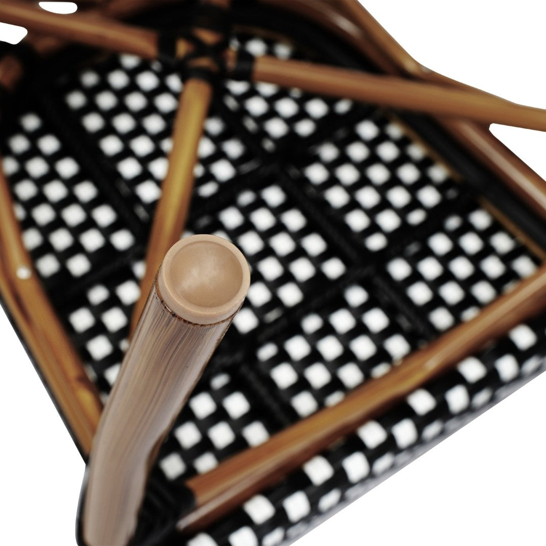 - Materials & finish: Aluminum frame, HDPE/PE rattan seat and back in black & white with black frame