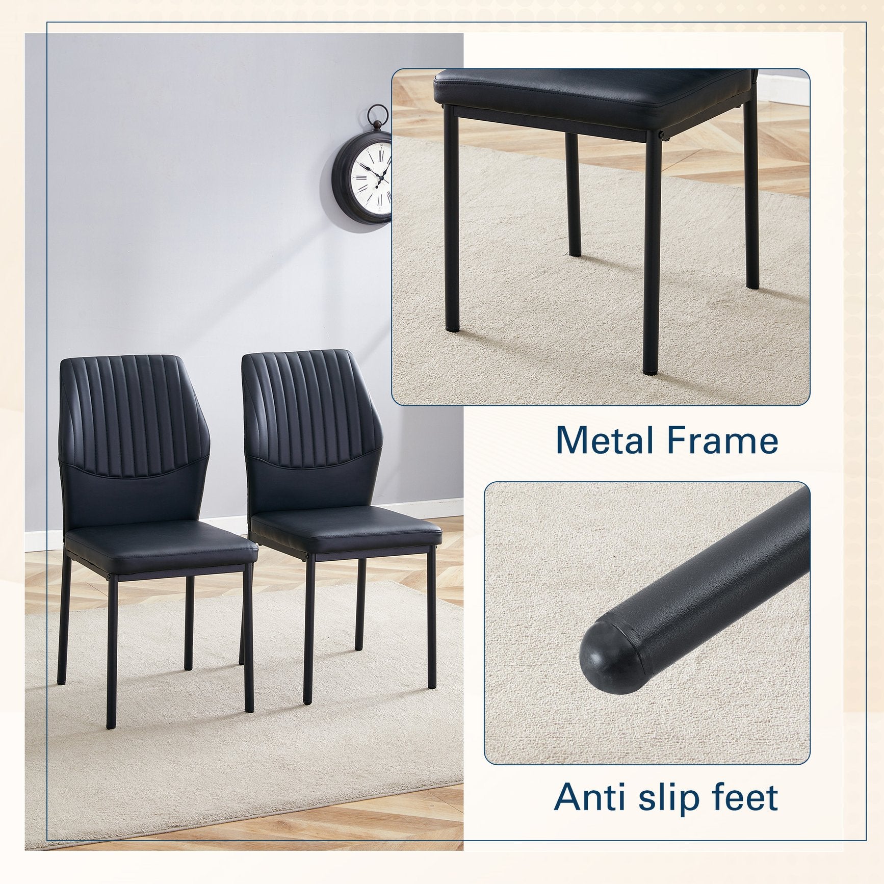 - These chairs, with their modern design, comfortable seating experience, and versatility, are perfect for families or commercial places that pursue fashion and quality living. This classic color combination is suitable for various interior decoration styles and easy to blend into different environments.
