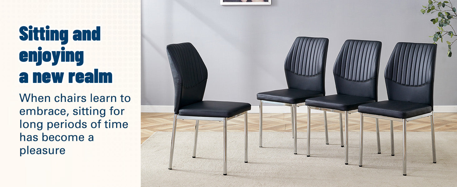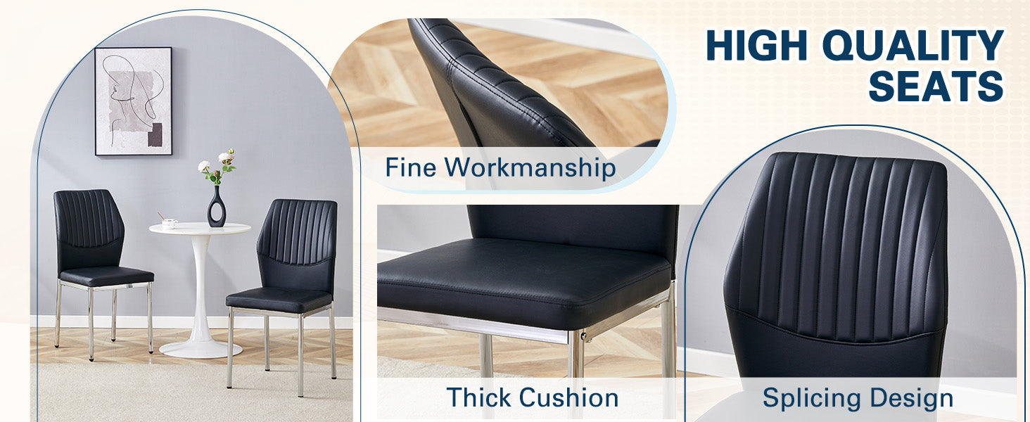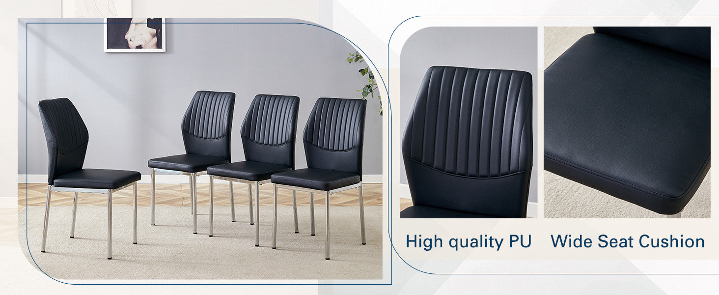 Bring modern elegance and everyday comfort to your dining space with this set of six luxury chairs. Upholstered in durable black PU leather with a refined vertical-stripe back and supported by sleek silver metal legs, each chair combines ergonomic support, resilient cushioning, and polished craftsmanship for a stylish yet practical seating solution ideal for homes, cafes, or event spaces.