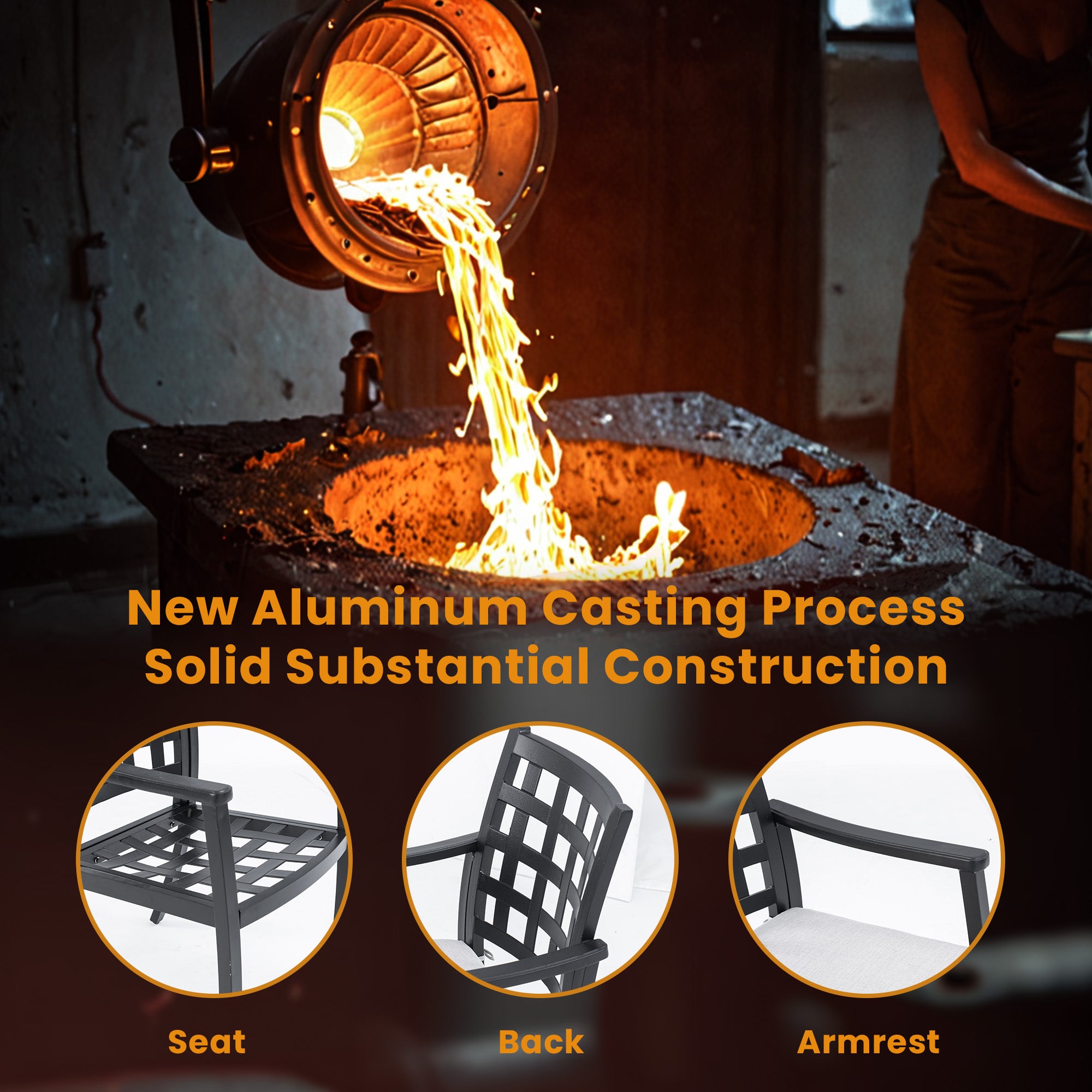 - Crafted with cast aluminum technology, this dining chair features a seamless design integrating backrest, seat, and armrests for exceptional durability and heavy-duty performance. Its textured Ember Black powder-coated finish enhances weather resistance and offers easy maintenance, making it both stylish and practical for outdoor use.