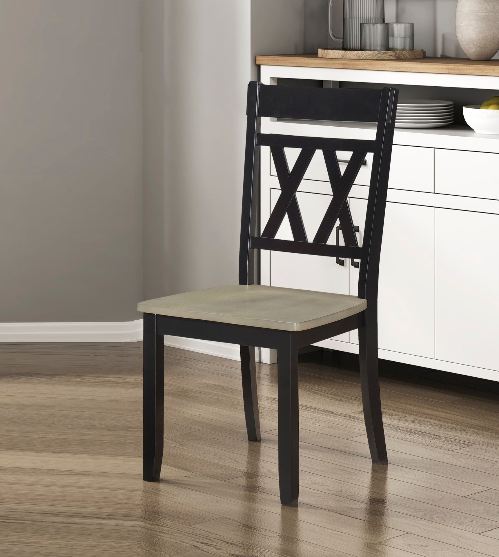 Elevate your dining space with a refined blend of farmhouse warmth and contemporary style. This two-piece set of side chairs pairs a classic X-back silhouette with a two-tone finish—antique black wood frame and greywash seats—for a look that's both timeless and on-trend. Built for everyday use, these chairs offer comfortable seating and sturdy construction that fits seamlessly into dining rooms, kitchens, or as accent seating.