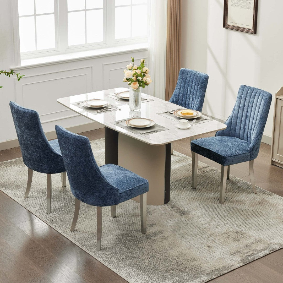 Elevate your dining space with these chic, comfortable chenille-upholstered dining chairs. Designed for both style and support, each chair features a high backrest, plush cushioning with durable spring support, and sleek silver brushed stainless steel legs—perfect for modern, luxury, or retro interiors. Sold as a set of 2 in a rich blue rayon flocking fabric, these chairs blend tactile softness with long-lasting construction for everyday dining or occasional entertaining.