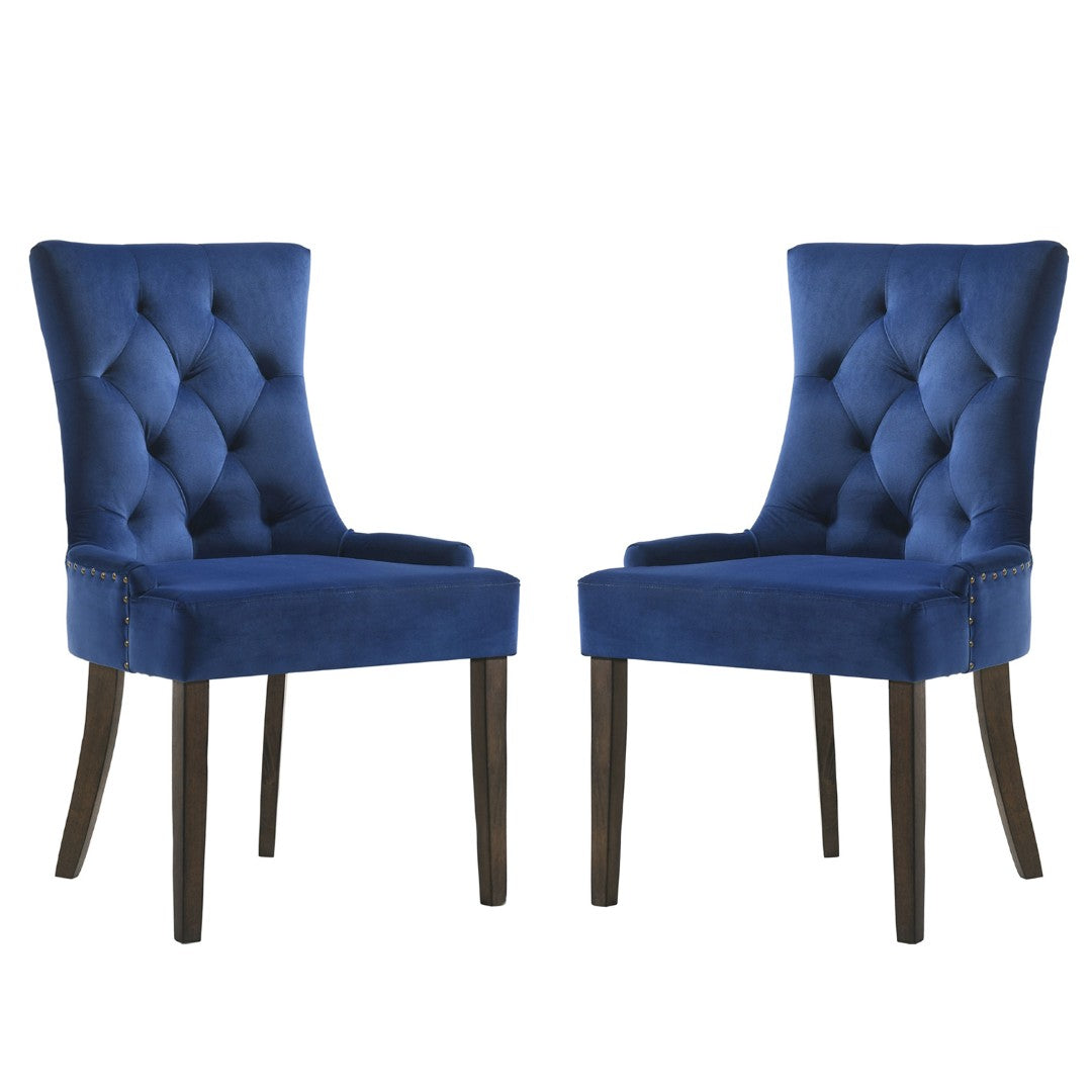 Elevate your dining space with this elegant pair of velvet-upholstered dining chairs, styled in rich blue with a weathered oak finish. Designed for both comfort and timeless appeal, each chair combines plush cushioning, refined detailing, and sturdy construction to complement a variety of décor styles—from modern transitional to classic traditional.