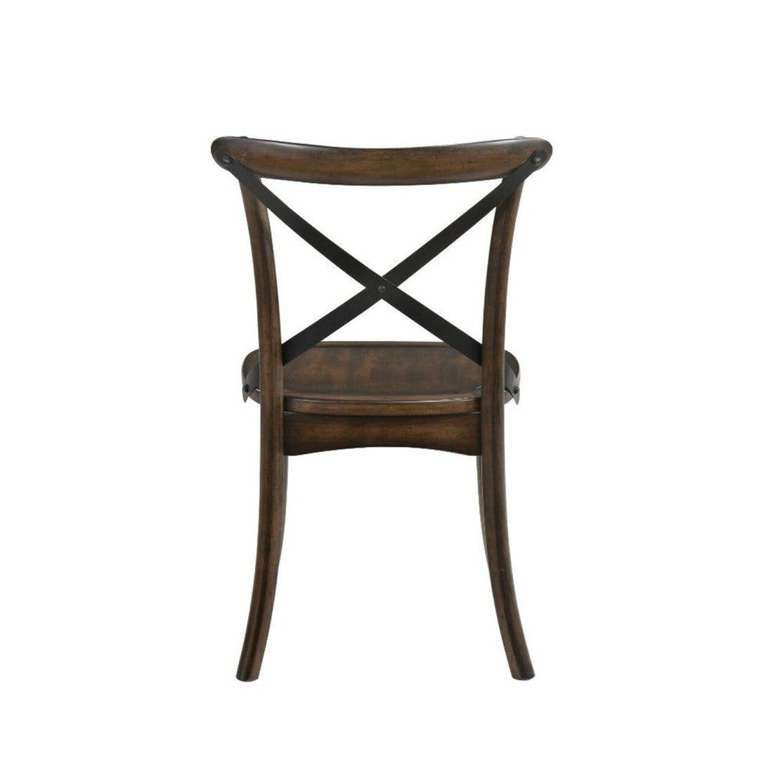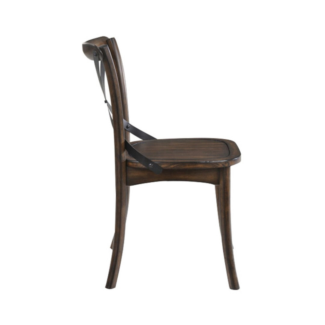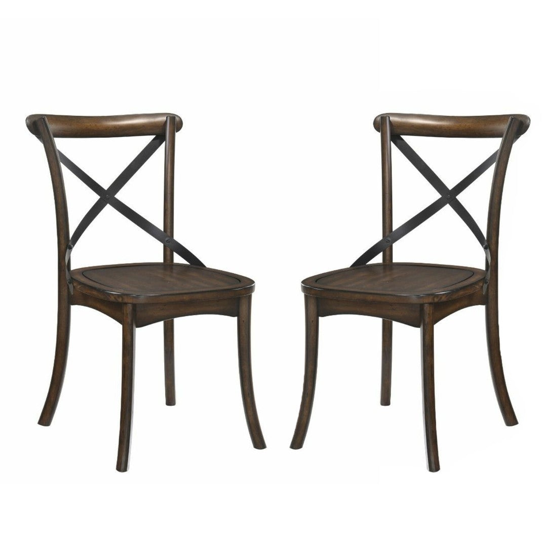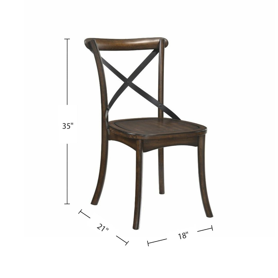 Add a touch of mid-century modern charm to your dining space with this set of two metal-back side chairs. The striking X-shaped metal backrest creates a focal point while the warm dark oak veneer seat and flared wooden legs deliver comfort and a refined, cohesive look. Built for everyday use, these chairs combine sculptural style with durable construction to complement both contemporary and traditional dining collections.