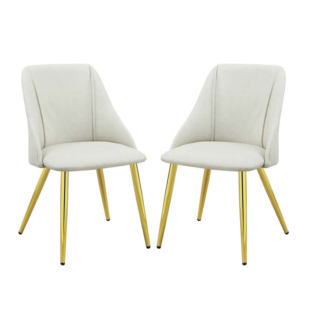 Bring modern elegance to your dining area with this set of two white synthetic leather side chairs. Clean lines, a smooth PU upholstery, and a gleaming gold-toned metal base combine for a chic, contemporary look that complements a variety of interiors—from minimalist to glam. These chairs offer comfortable seating for everyday dining or entertaining while making a stylish visual statement.