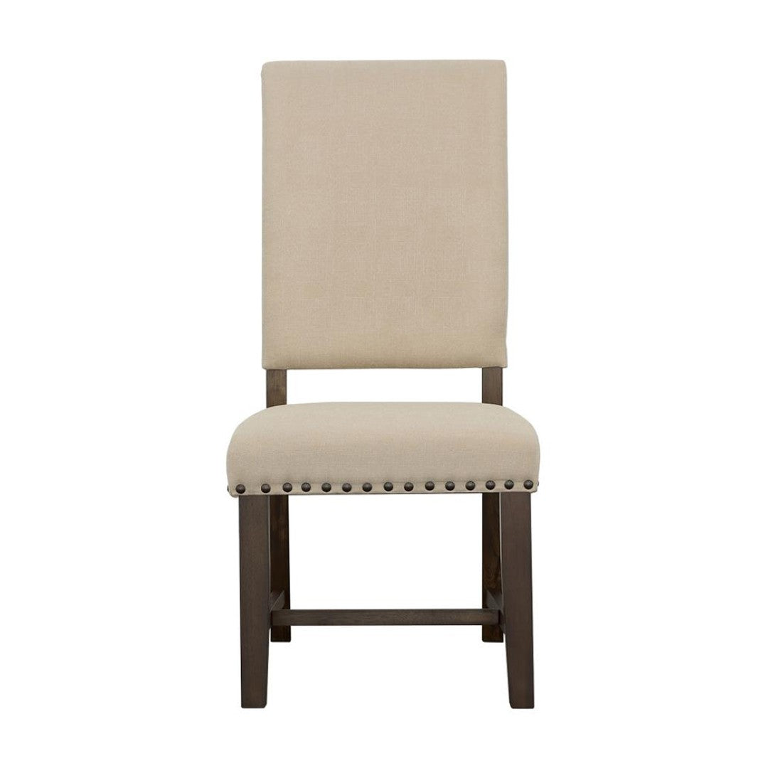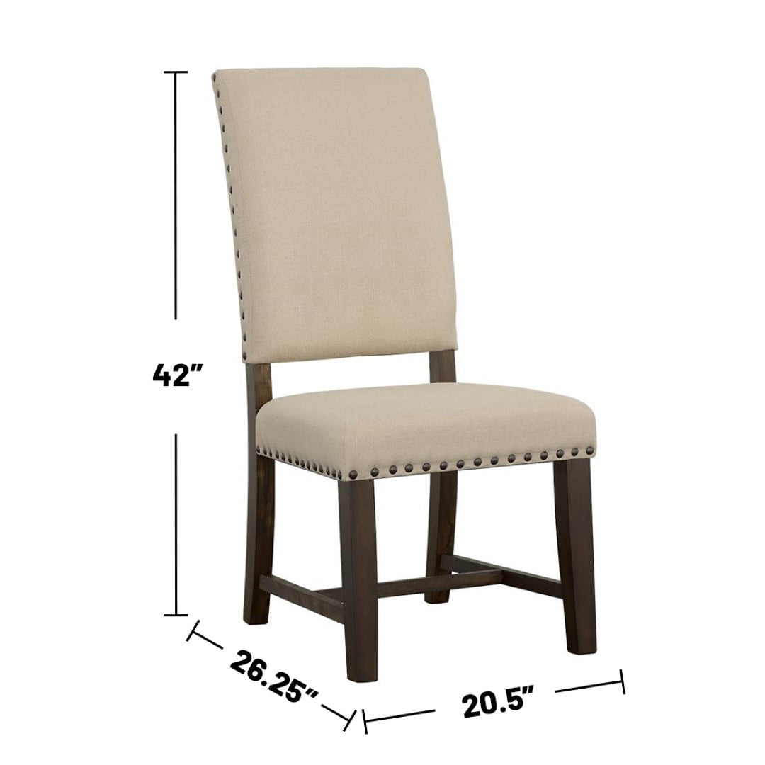 - Seating for two: Set includes 2 fabric-upholstered dining chairs in complementary beige and smokey black tones.