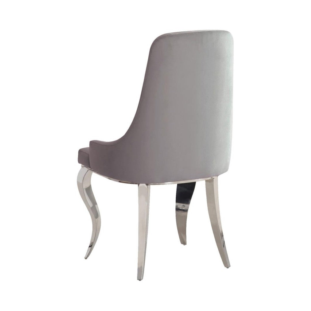 Elevate your dining or seating area with a pair of elegant velvet side chairs that combine modern shine with classic comfort. These grey upholstered chairs feature a slipper-style silhouette and plush cushioning for comfortable, extended seating, while polished chrome legs add a refined, contemporary contrast. Ideal for formal dining rooms, living spaces, or accent seating, this set of two balances style, support, and durable construction.