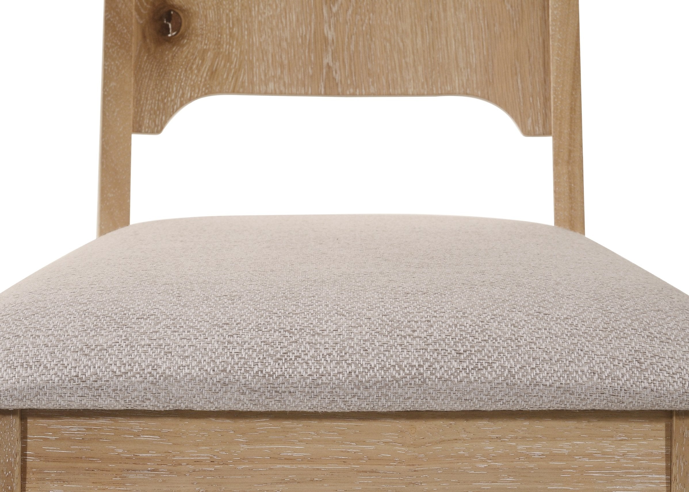 Bring warm, contemporary style to your dining space with this set of 2 upholstered side chairs. The warm wood frame and soft beige fabric create a versatile look that complements modern, Scandinavian, and transitional interiors. Armless design and cushioned seats provide comfort for long meals and conversation, while the spat-back wood panel adds subtle visual interest and sturdy support. Simple assembly required.