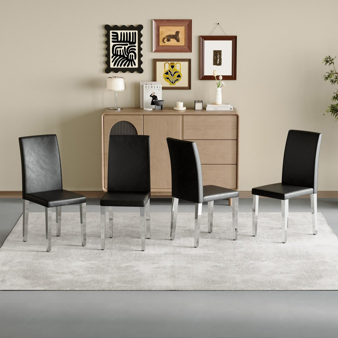 Brighten your dining or workspace with this sleek set of four black PU backrest chairs featuring silver metal legs — a minimalist, modern choice that blends comfort, durability, and easy maintenance. Thoughtfully designed to complement contemporary interiors, these chairs offer ergonomic support, effortless cleaning, and a refined chrome-accent look that elevates any room.