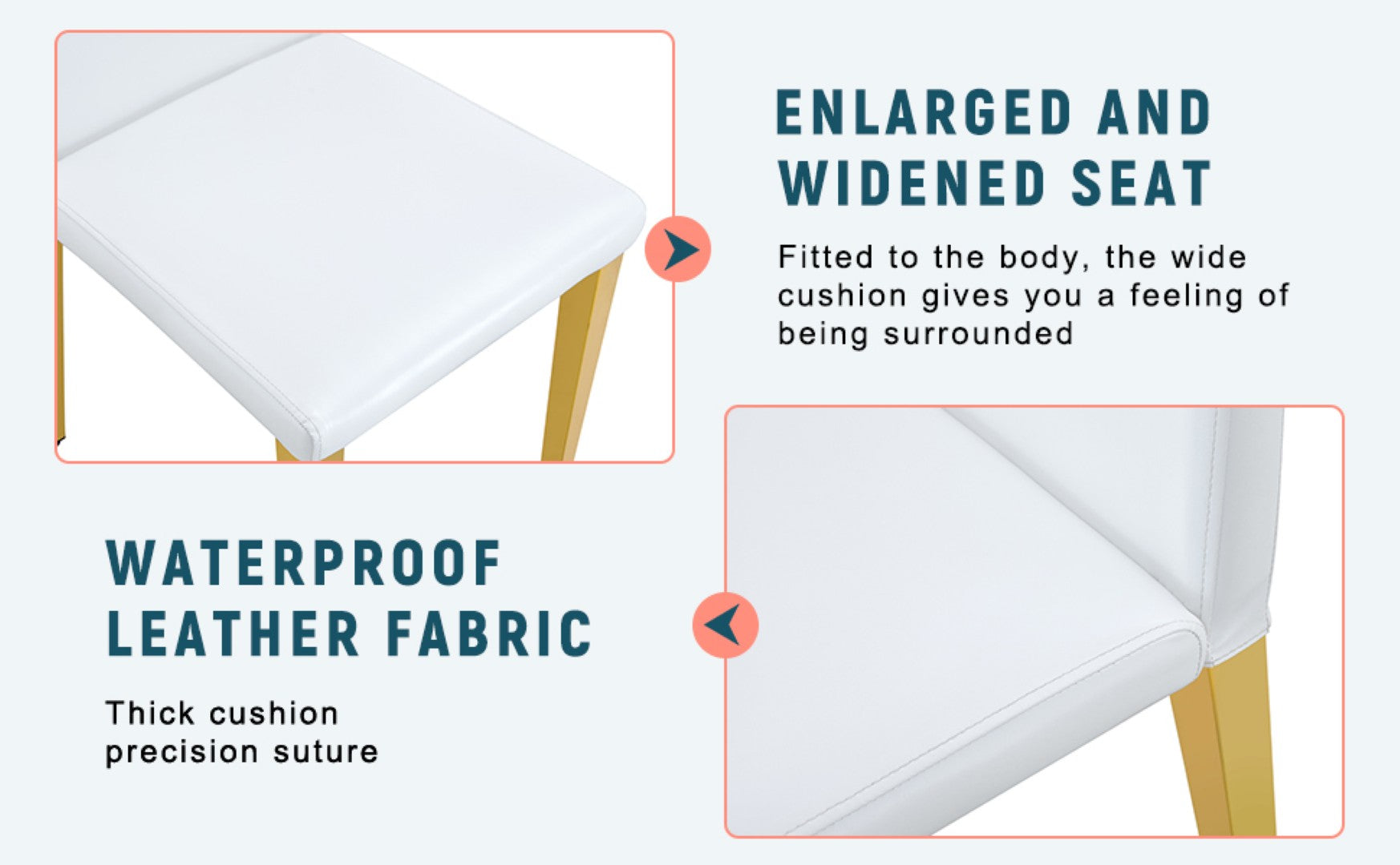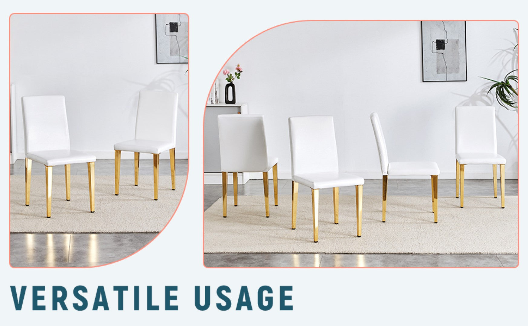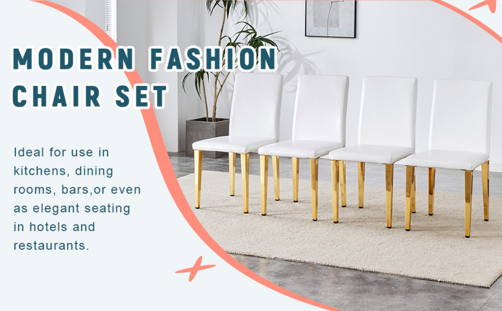 Refresh your dining or living space with this chic set of four chairs that blends minimalist elegance with everyday practicality. Smooth white PU upholstery and polished gold metal legs create a light, modern silhouette that complements contemporary, Scandinavian, and eclectic interiors—while ergonomic padding and durable construction ensure comfort and longevity for daily use.