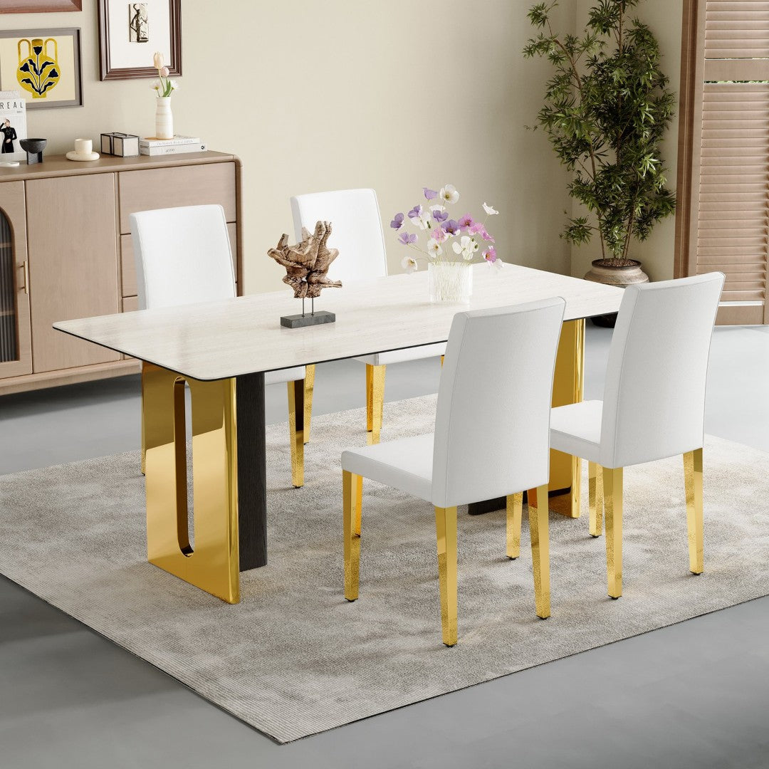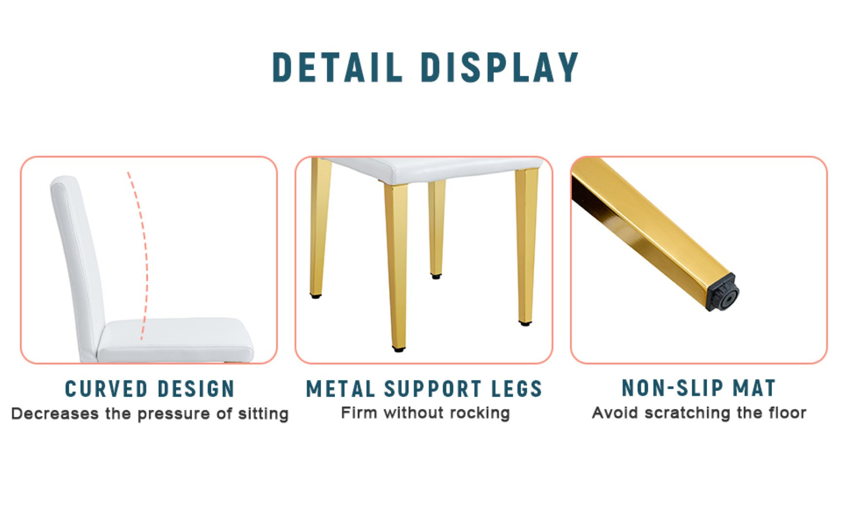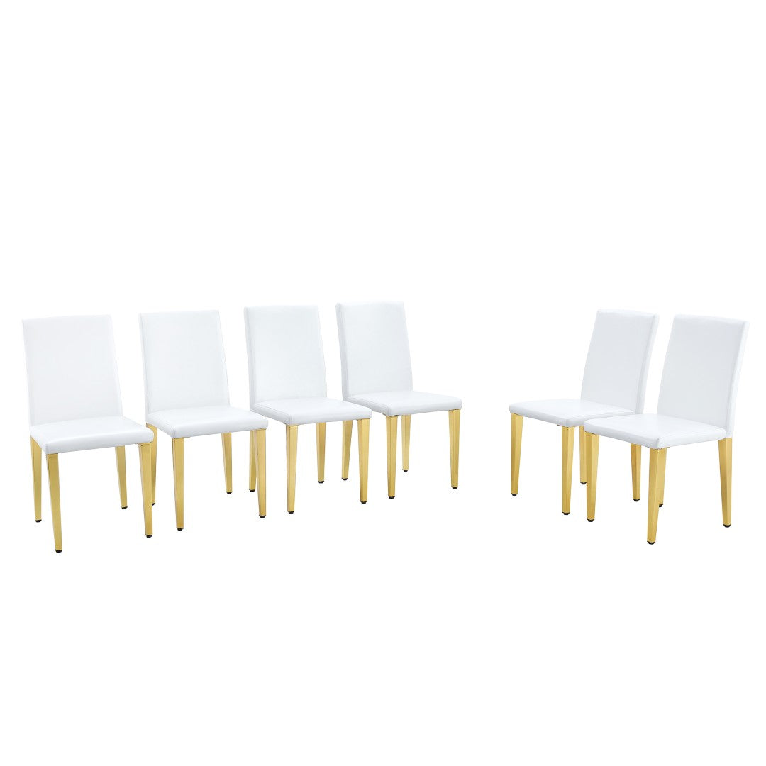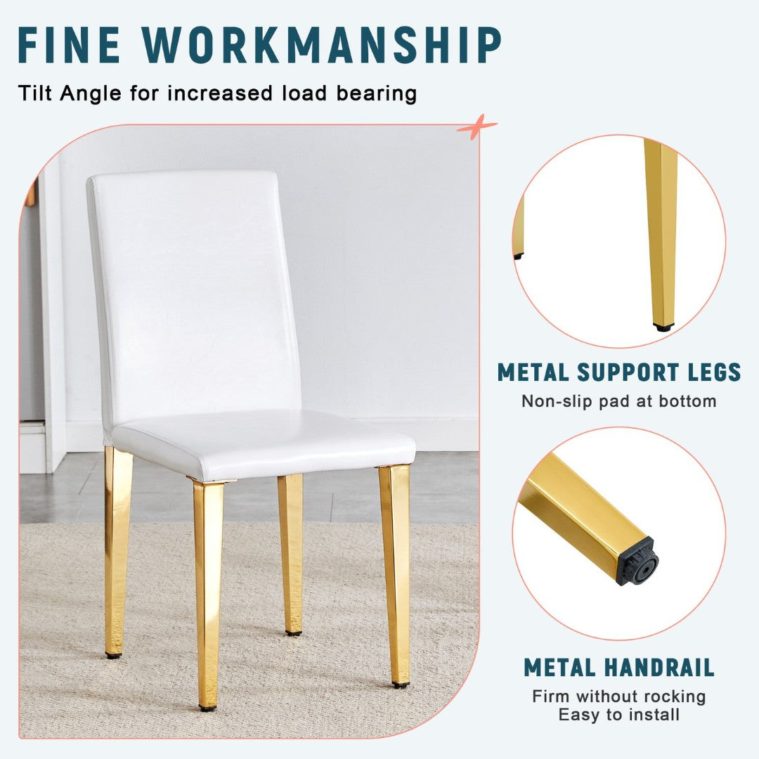 Refresh your dining or living space with this chic set of four chairs that blends minimalist elegance with everyday practicality. Smooth white PU upholstery and polished gold metal legs create a light, modern silhouette that complements contemporary, Scandinavian, and eclectic interiors—while ergonomic padding and durable construction ensure comfort and longevity for daily use.