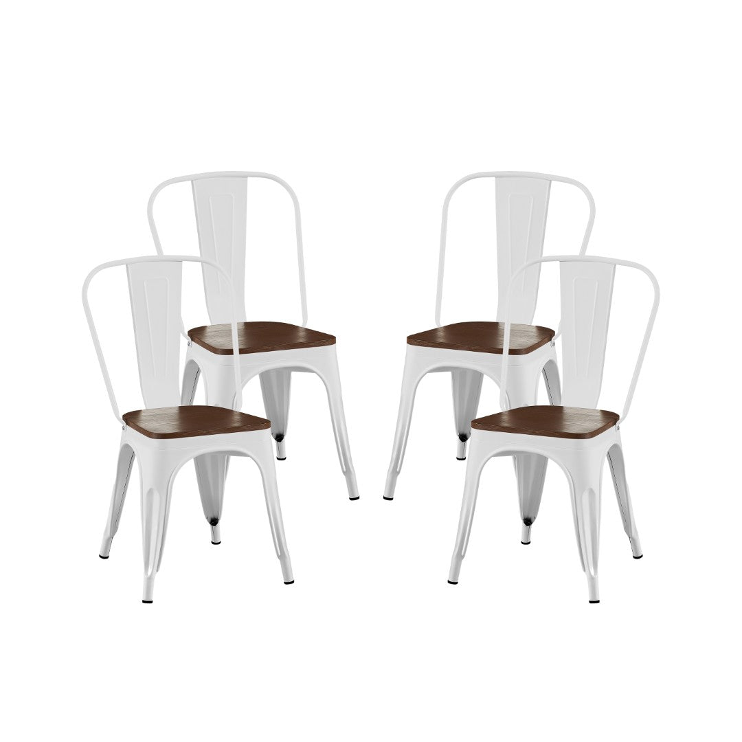 - What's Included: Set of 4 High Gloss White with Walnut Wooden Seat Industrial Metal Dining Chairs.