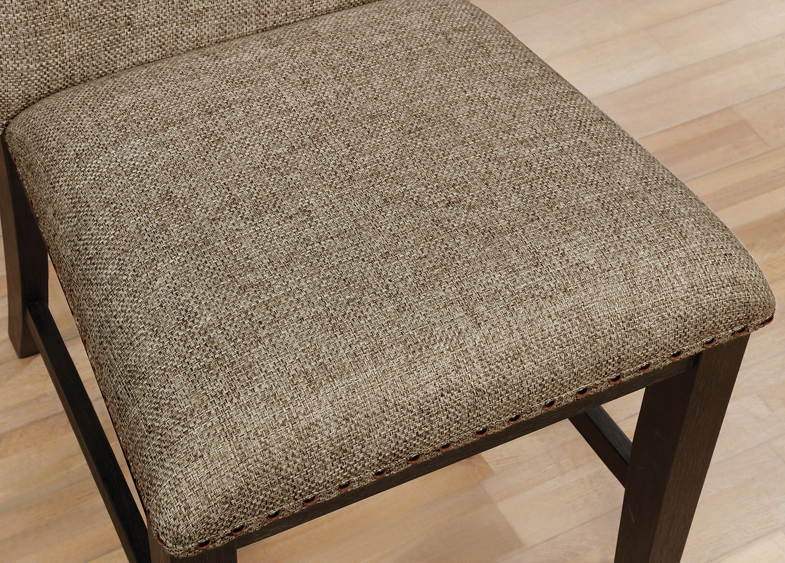 Elevate your dining space with a pair of transitional side chairs that blend classic detailing and modern comfort. Upholstered in warm gray fabric with espresso-finished frames and nailhead trim, these chairs bring subtle elegance and sturdy support to family meals, casual dinners, or extra seating for guests. Padded seats and backs ensure comfortable seating while the compact footprint fits well in smaller dining areas.