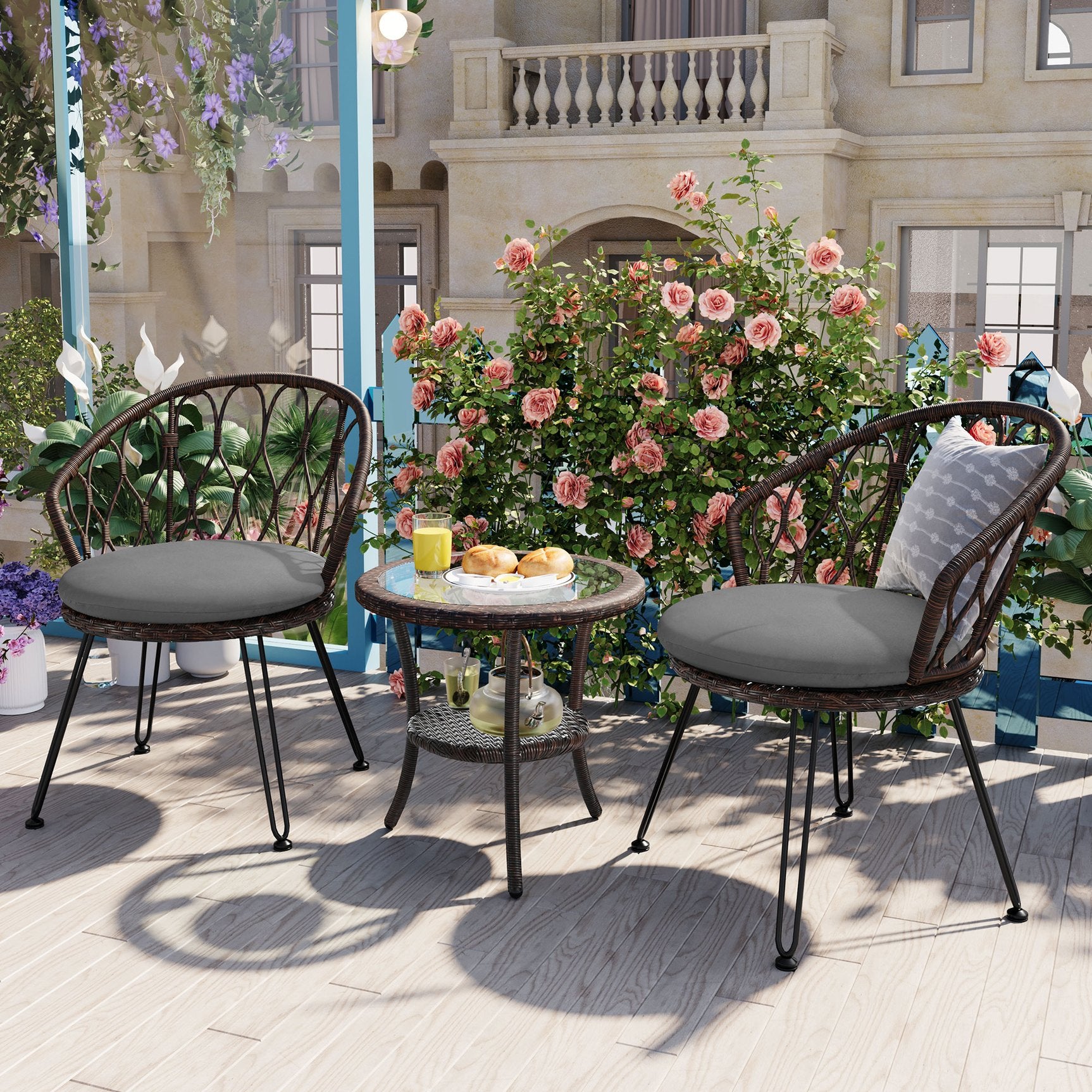 Create an inviting outdoor conversation corner with this compact, stylish 3-piece leisure set—perfect for patios, balconies, and courtyards. Designed for comfortable lounging and easy maintenance, the set pairs two rattan single chairs with a tempered-glass round table to deliver durable performance and a cohesive modern look.