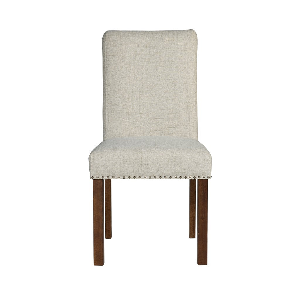 Elevate your dining space with this elegant set of two upholstered chairs, blending classic details and modern comfort. Each chair features a graceful rollback silhouette, decorative silver nailhead trim, and a durable medium-walnut finish that pairs seamlessly with a variety of table styles—perfect for formal dining rooms, kitchens, or as stylish accent seating.