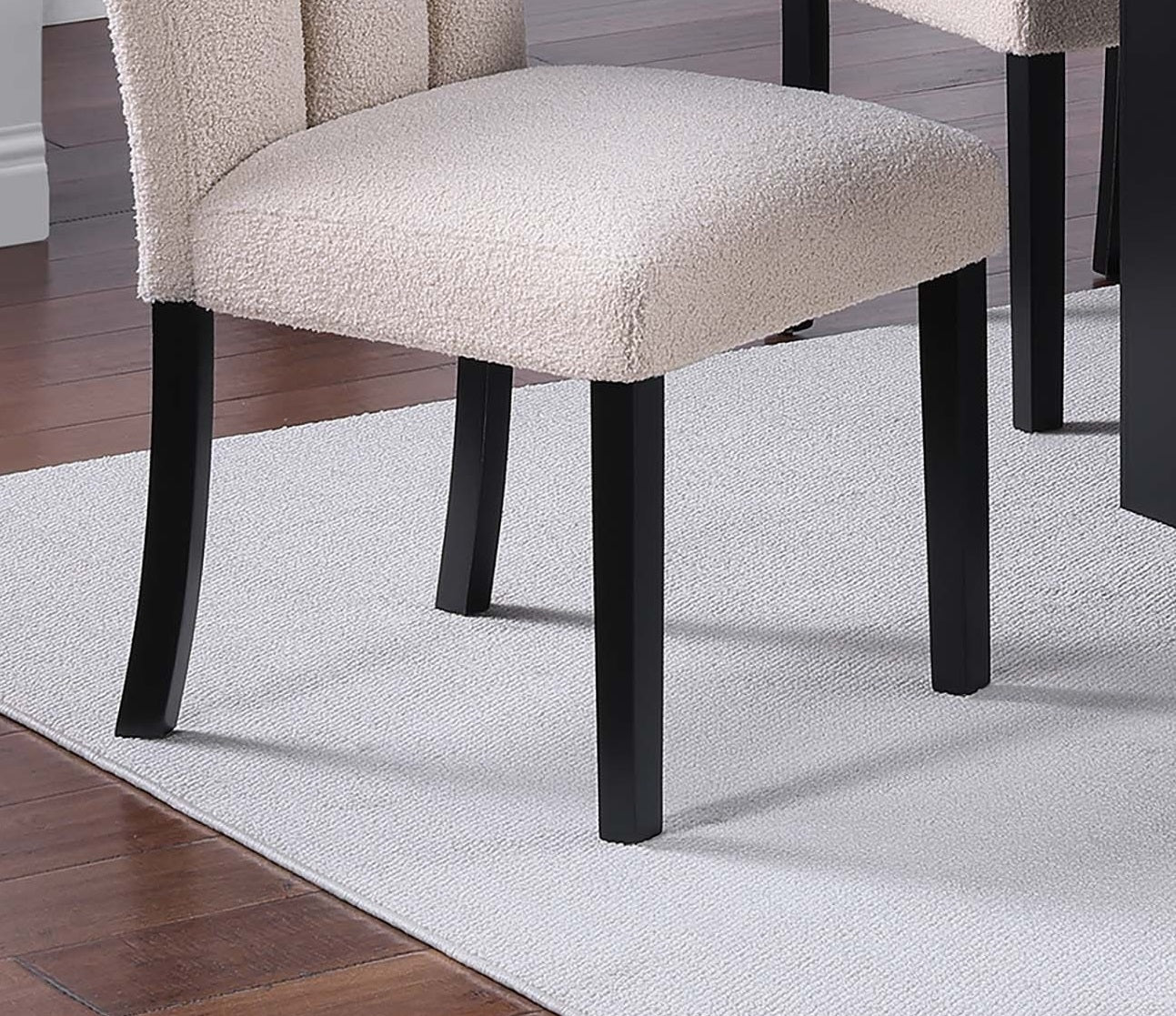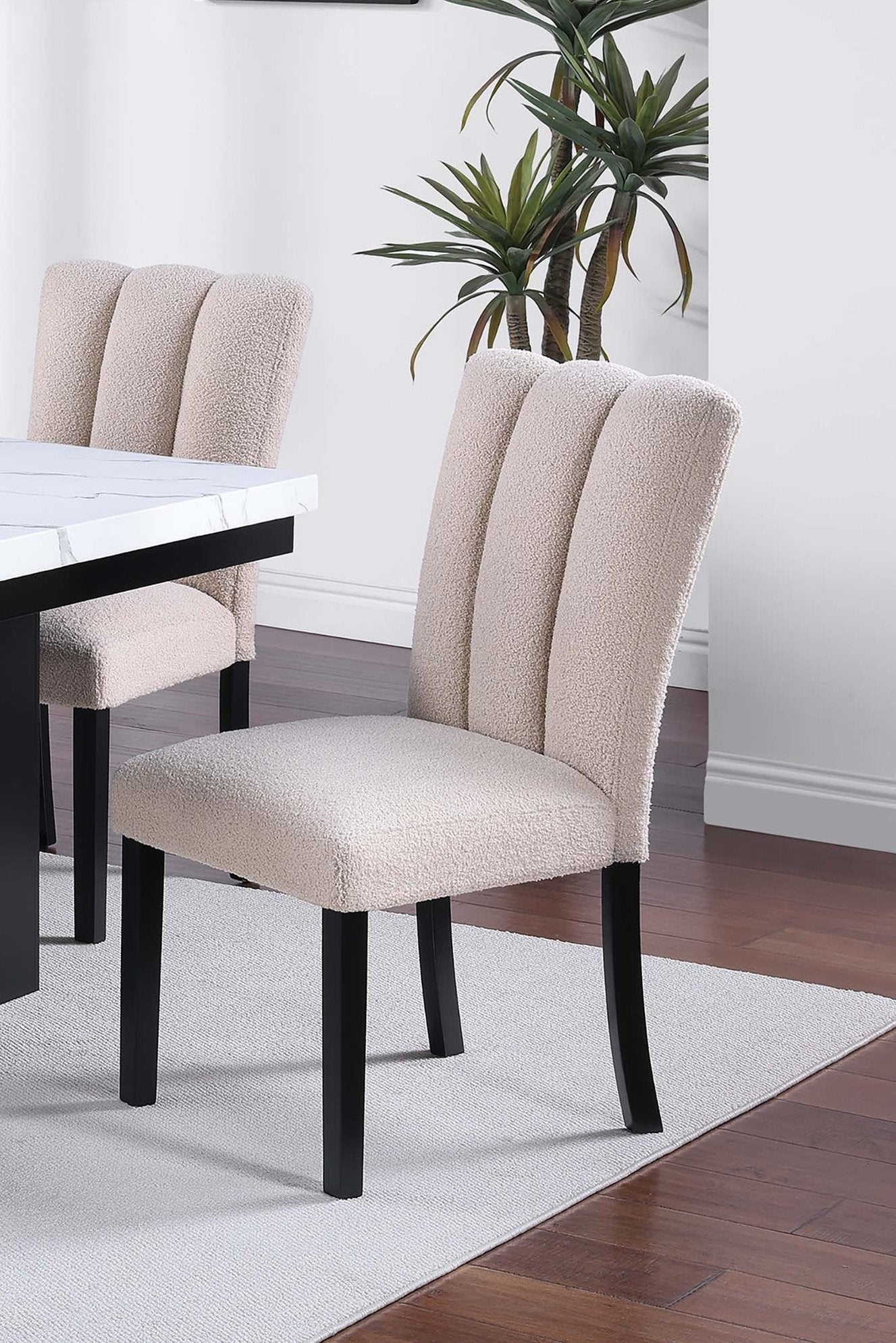 Bring modern sophistication and everyday comfort to your dining area with this upholstered side chair set. Wrapped in soft, neutral-tone fabric and featuring subtle channel-style tufting, these chairs combine a warm, inviting texture with a streamlined silhouette. Black wooden legs—curved in the back and gently tapered in front—provide sturdy support and a refined profile that complements contemporary, transitional, or minimalist interiors. Ideal for dining rooms, kitchens, or casual office seating, this two-piece set pairs easily with a variety of tables and décor.