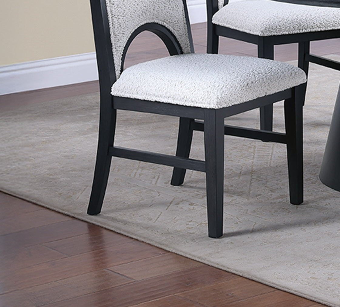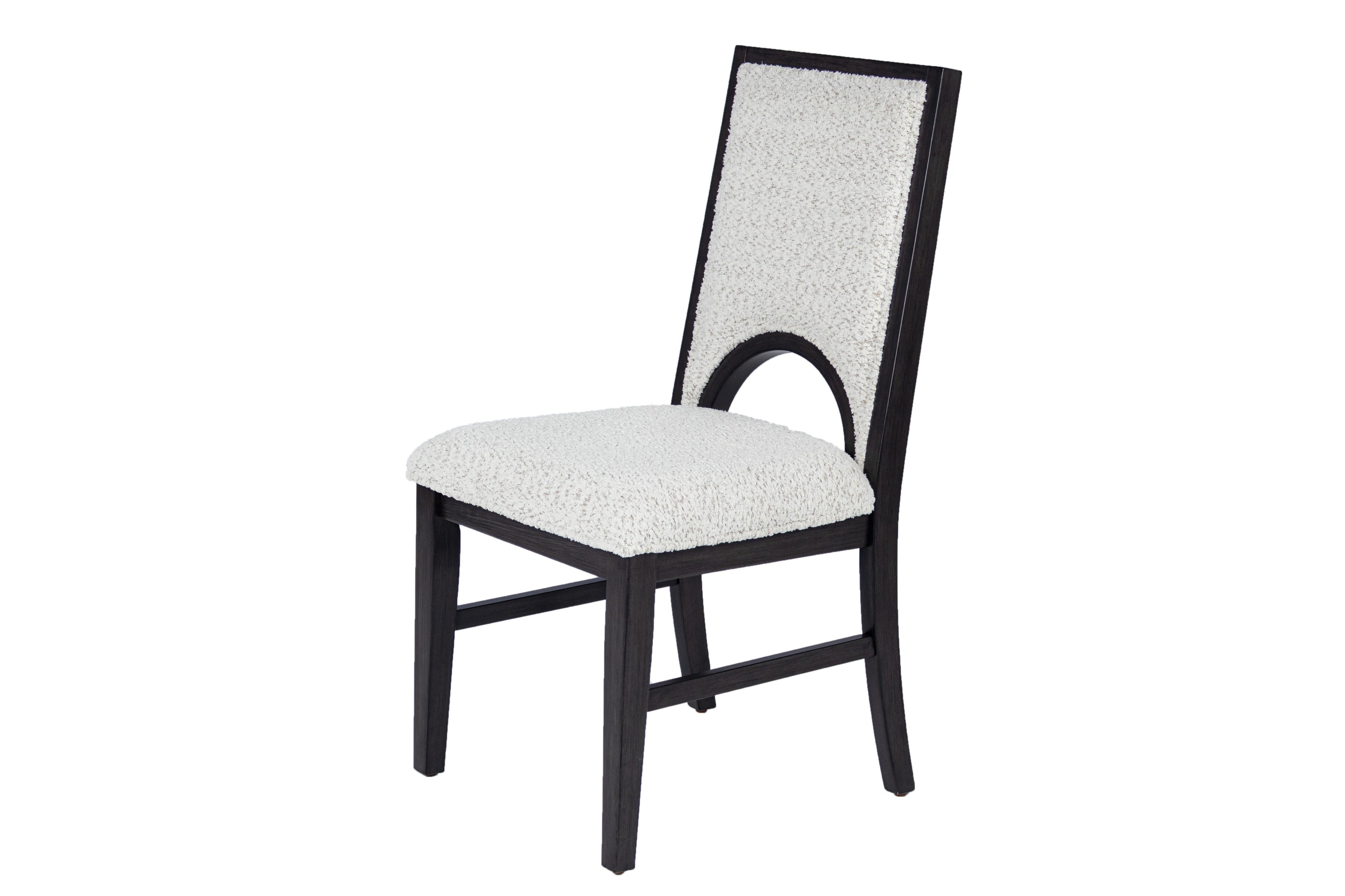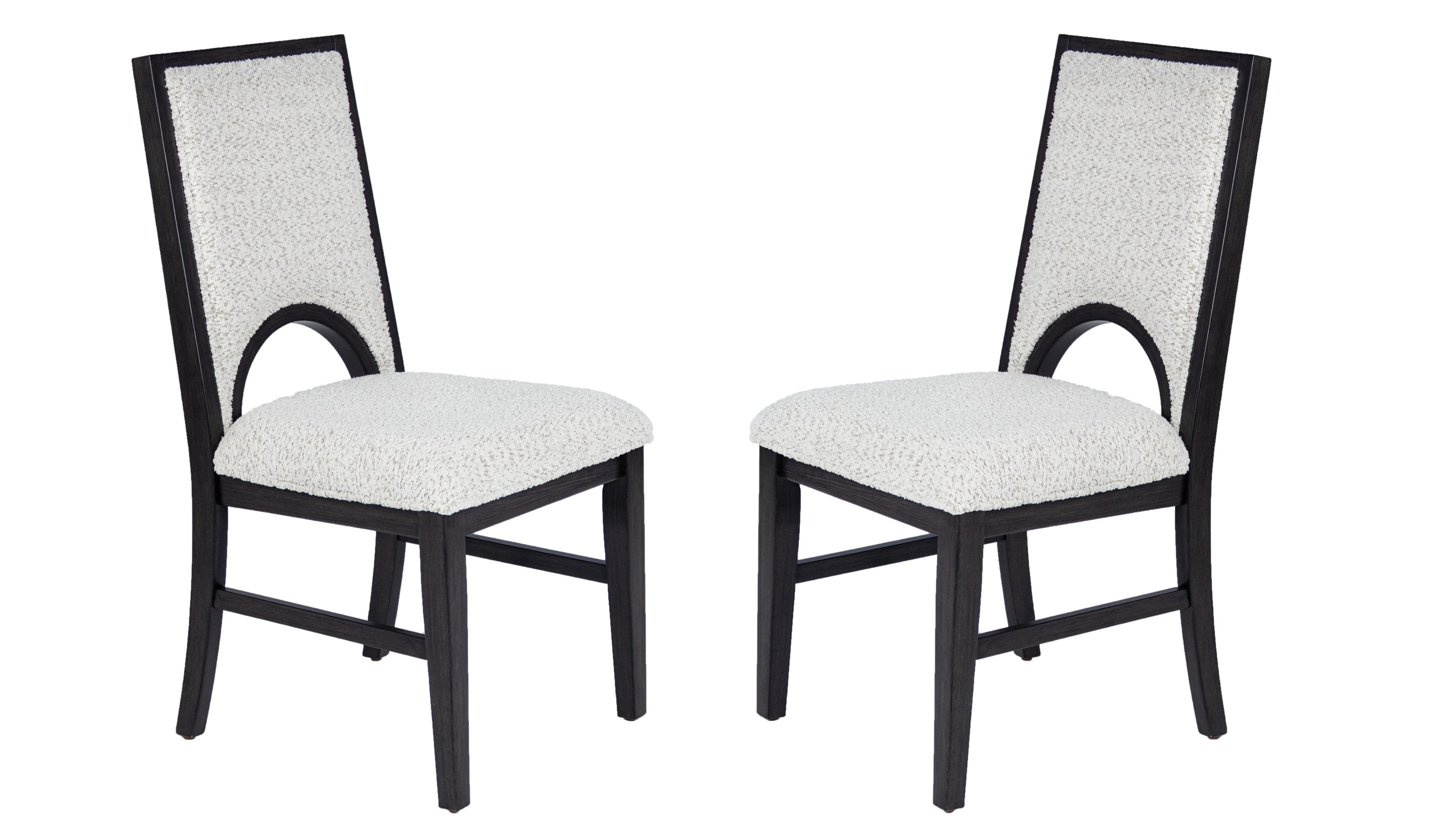 Bring understated elegance and everyday comfort to your dining space with this pair of upholstered dining chairs. Clean lines, a contrasting black frame, and a soft white fabric create a modern yet timeless silhouette, while the distinctive arched cutout on the backrest adds visual interest without overwhelming your decor. Designed for comfort and easy coordination, these chairs are ideal for family meals, entertaining, or updating a breakfast nook.
