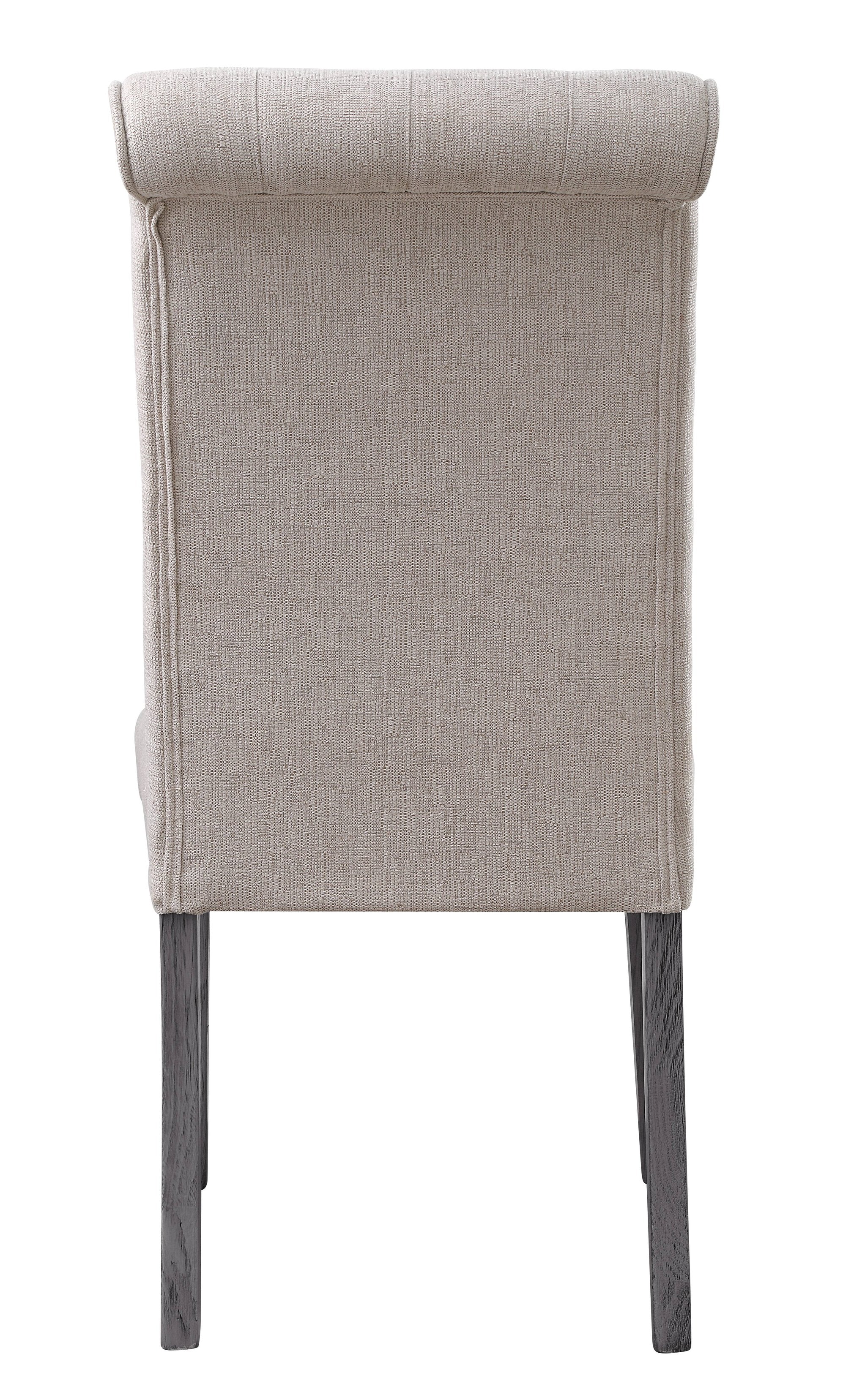 Refresh your dining or living space with this elegant pair of side chairs that blend modern lines with classic comfort. Upholstered in soft beige linen with a sophisticated gray finish on the frame, these armless chairs feature a gently curved, button-tufted back and plush 5" padded seats to provide supportive seating for everyday use or special gatherings.