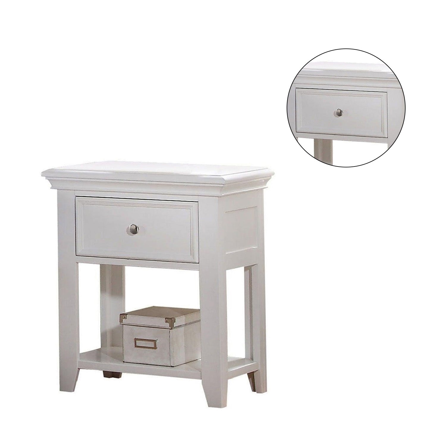 This compact, contemporary nightstand combines clean lines and practical storage to elevate your bedroom’s style and functionality. Finished in crisp white, it offers a subtle, calming presence that complements modern and transitional décor while keeping bedside essentials neatly organized.